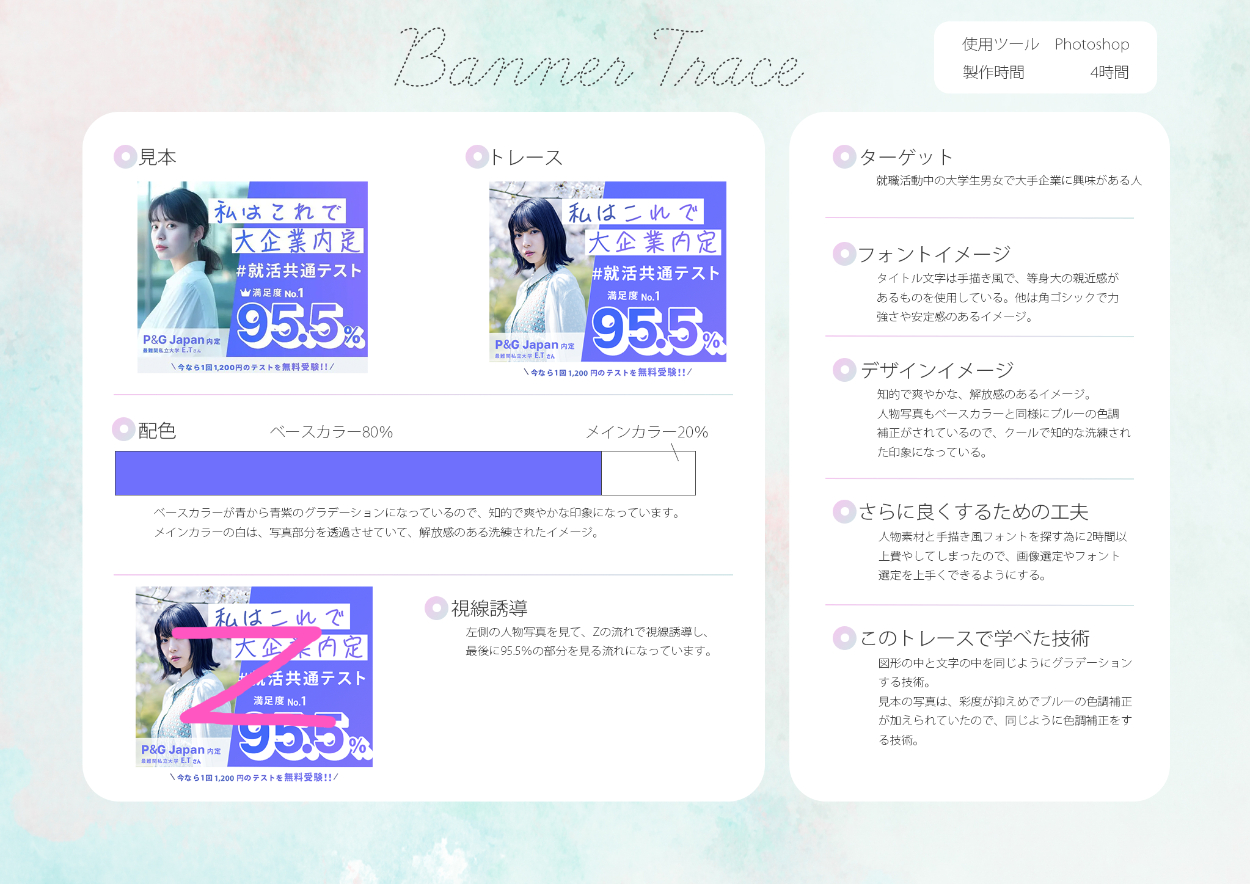 デザインの言語化・分析の為に、バナートレースを行いました。 記載内容│配色/視線誘導/ターゲット/フォントイメージ/デザインイメージ/さらに良くするための工夫/このトレースで学べた技術 所用時間│4時間 使用ツール│Photoshop
