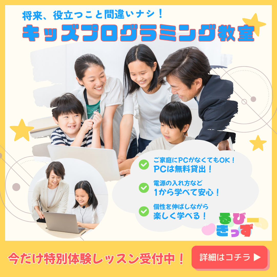 - キャンペーン情報 (今だけ特別体験レッスン受付中!ご家庭にPCがなくてもOK!入会してくださったご家庭にはPCを無料貸出! PCの電源の入れ方など1からまずはお教えします! )