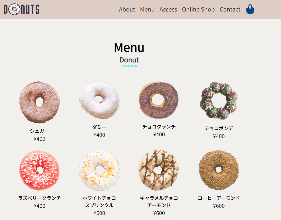 2 商品であるドーナツが目立つように、色づかい等、その他のデザインはシンプルに設計しました。