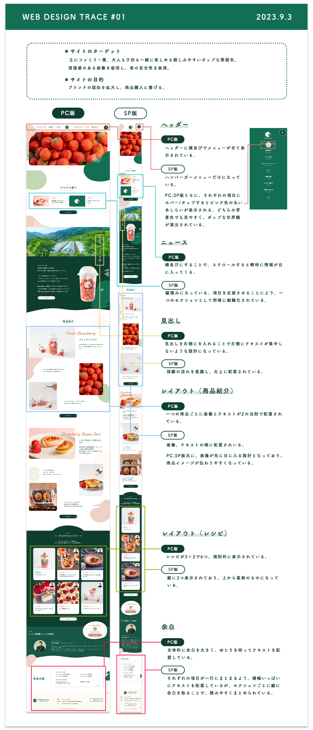 SHElikes MULTI CREATOR COURSEにて、既存のLPのトレースを行い、レスポンシブ対応のデザインの違いについてまとめました。