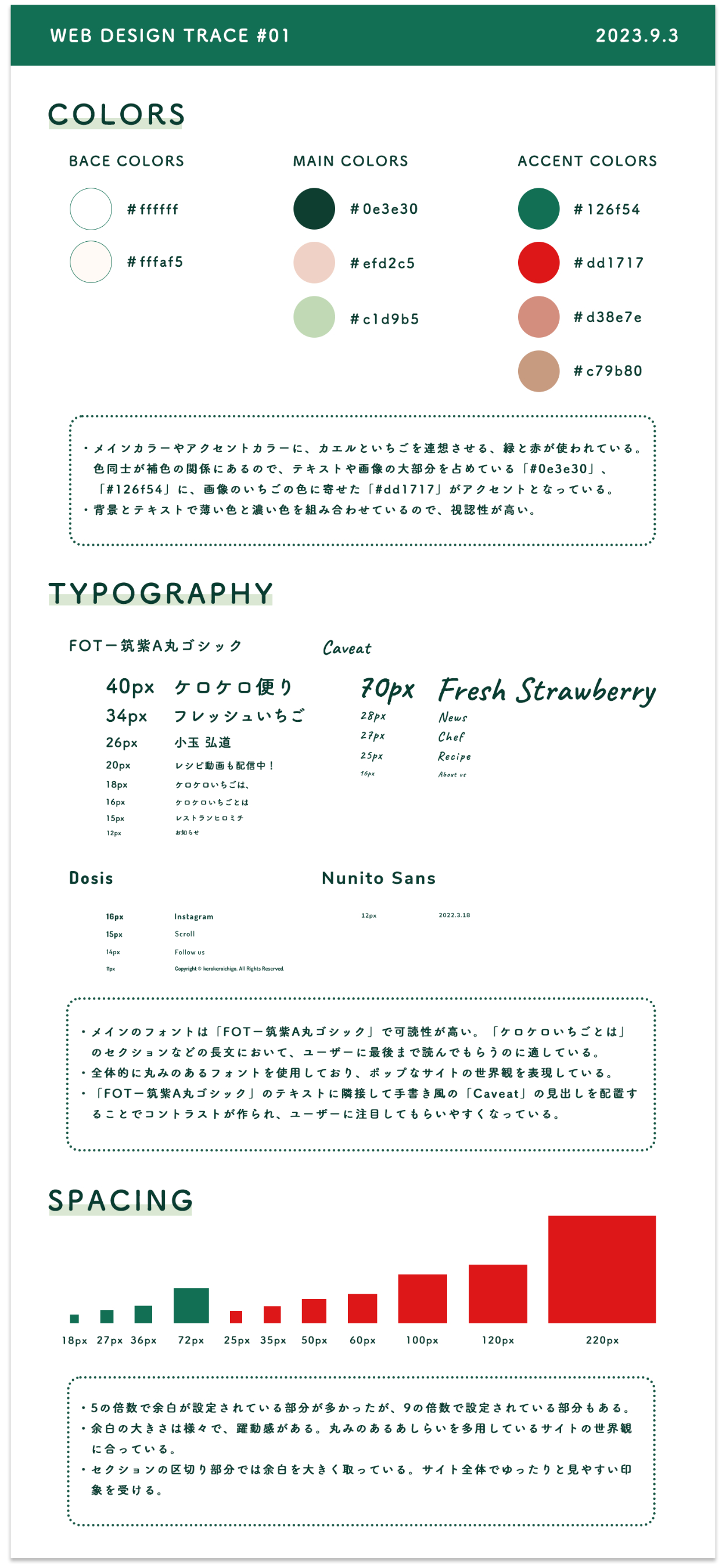 デベロッパーツールを上から下まで展開して、色、フォント、スペーシングを注意深く調べました。また、配置が規則的なもの、不規則的なものを捉え、それぞれがサイト内でどのように機能しているのか考えながらトレースを行いました。