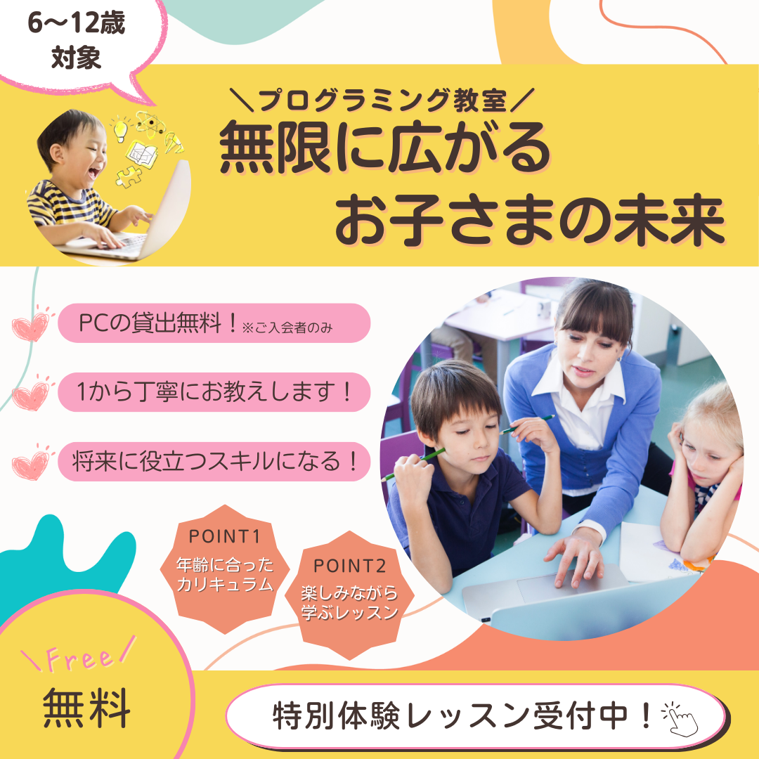 子供のプログラミング教室_ver1 ayumi9392 Webデザイナー OVERVIEW 子供のプログラミング教室の無料体験レッスン誘導バナー お子様向けのポップなイメージの雰囲気になるよう制作しました。6-12歳と年齢の幅が広いため、小学校低学年をイメージして制作しました。
