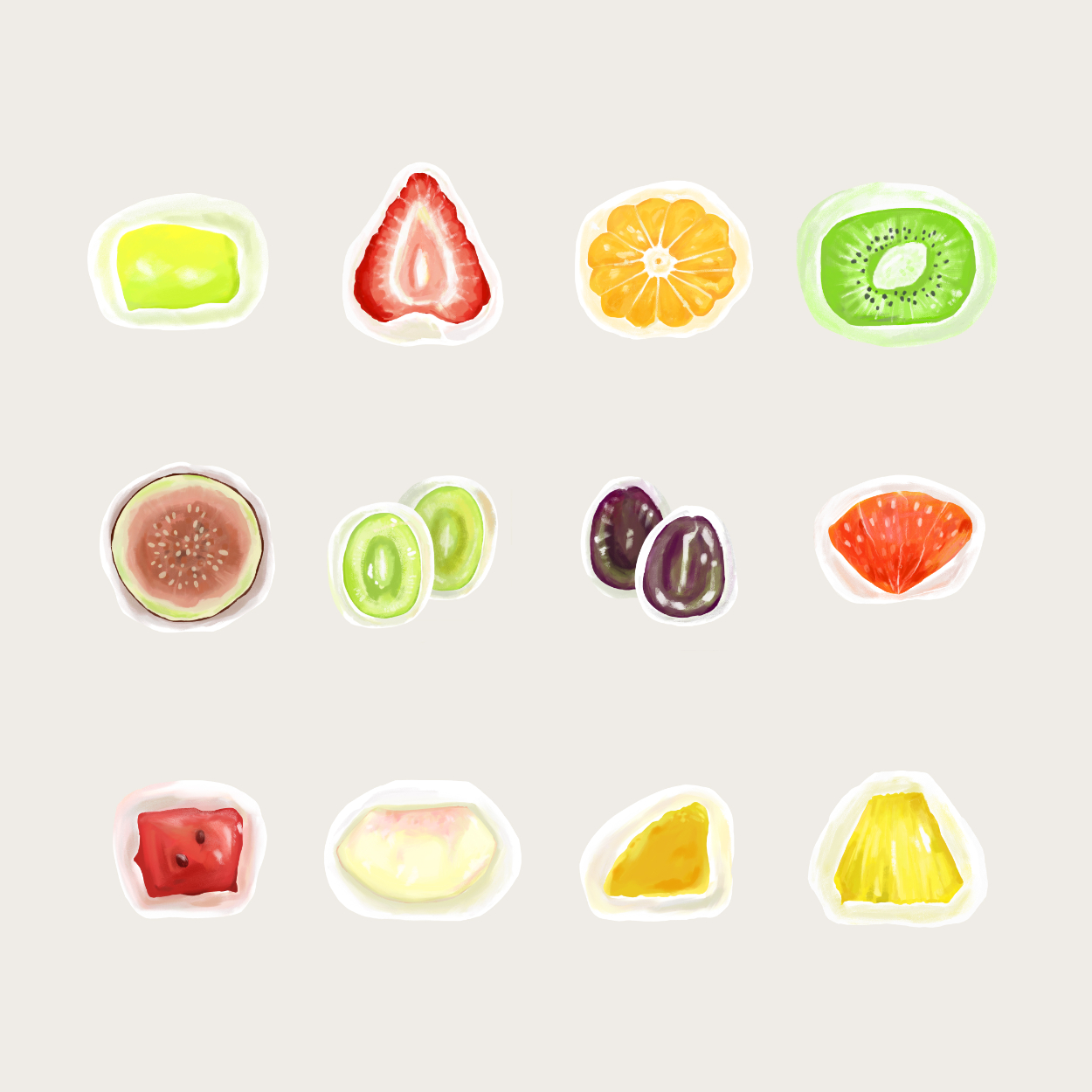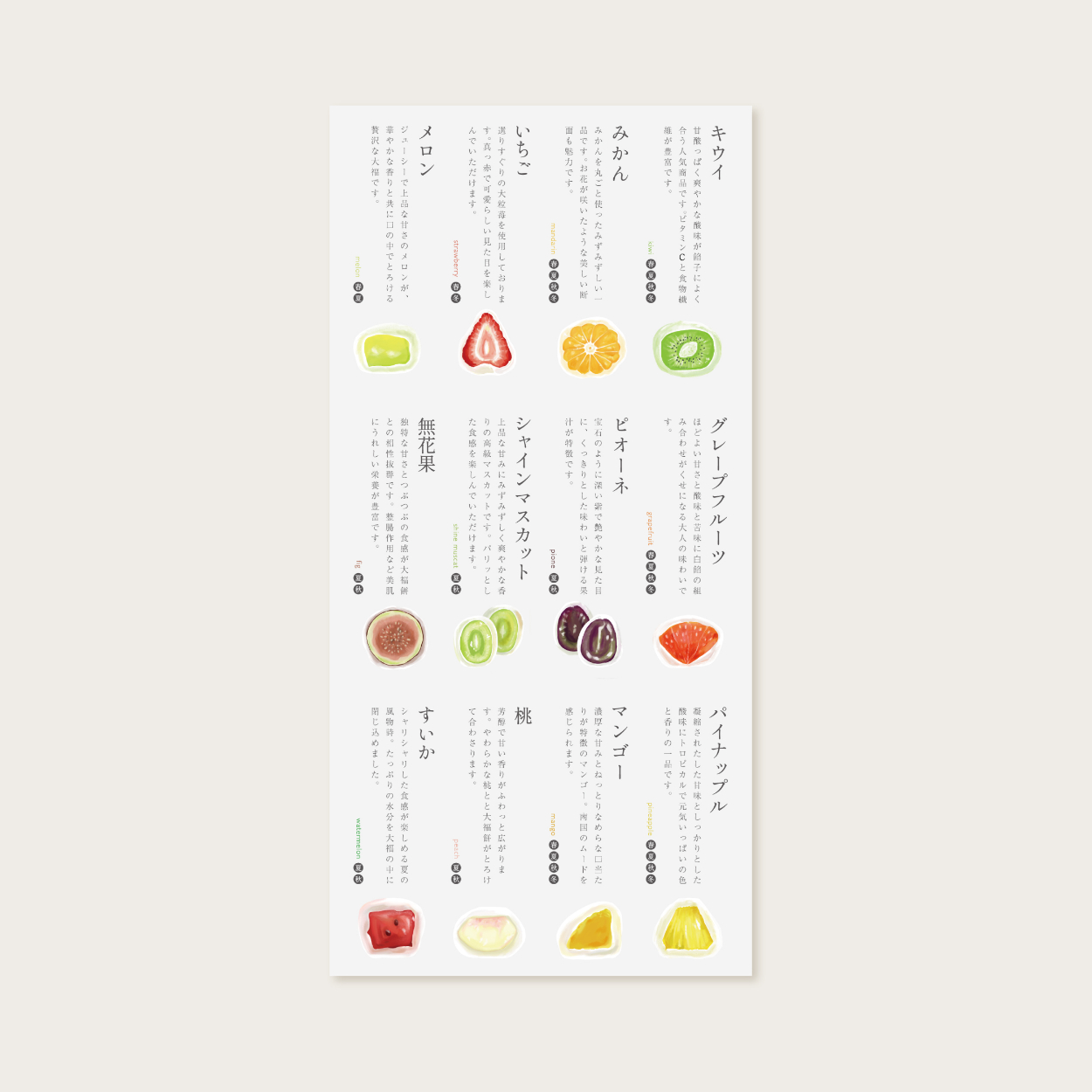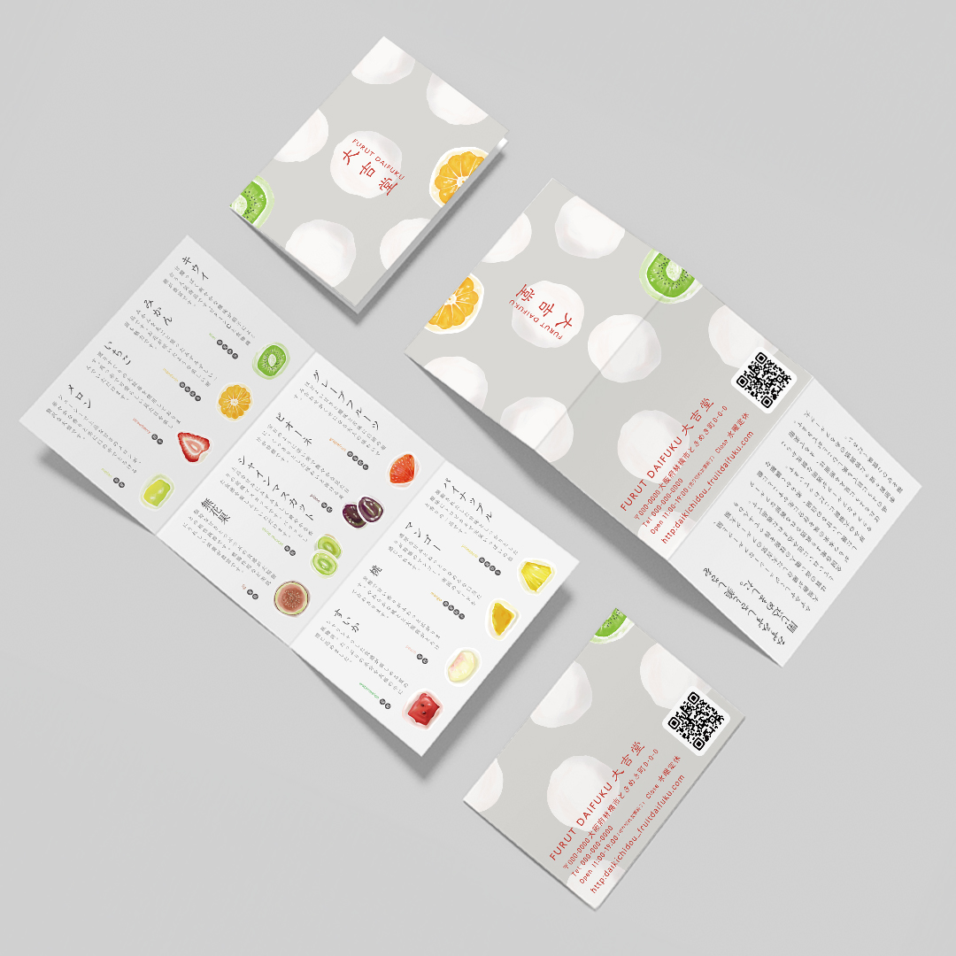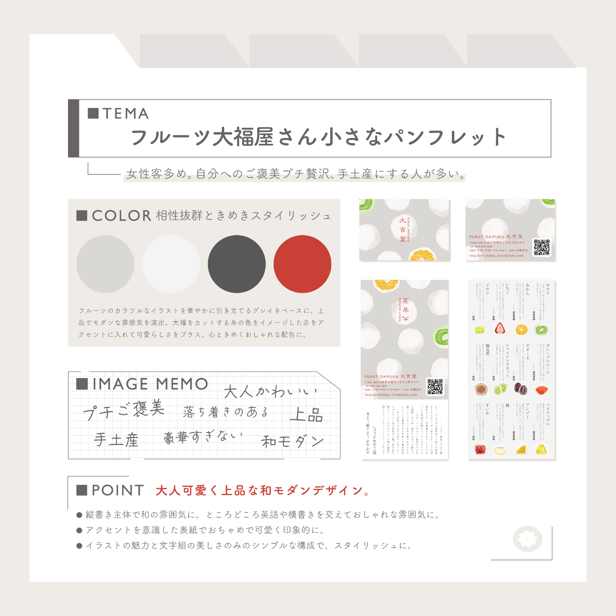 【自主制作】フルーツ大福屋さんの小さなリーフレット(イラスト・デザイン) KEIKO UEDA デザイナー/イラストレーター OVERVIEW 2024.8.24/制作時間:1週間/制作ツール:illustrator,adobefresco/コンセプト:大人かわいく上品な和モダンデザイン YEAR 2024