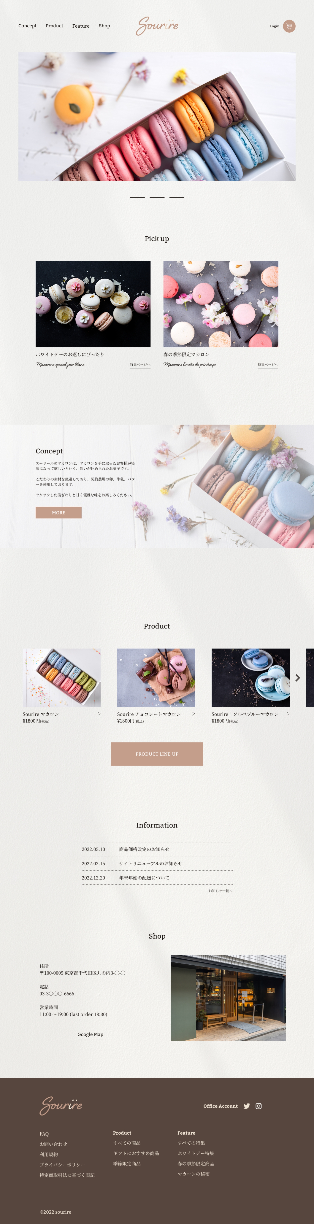 マカロン専門店サイトのPCのデザインカンプを作成しました。(使用ツール:Photoshop,Illustrator,XD/制作時間:1週間)