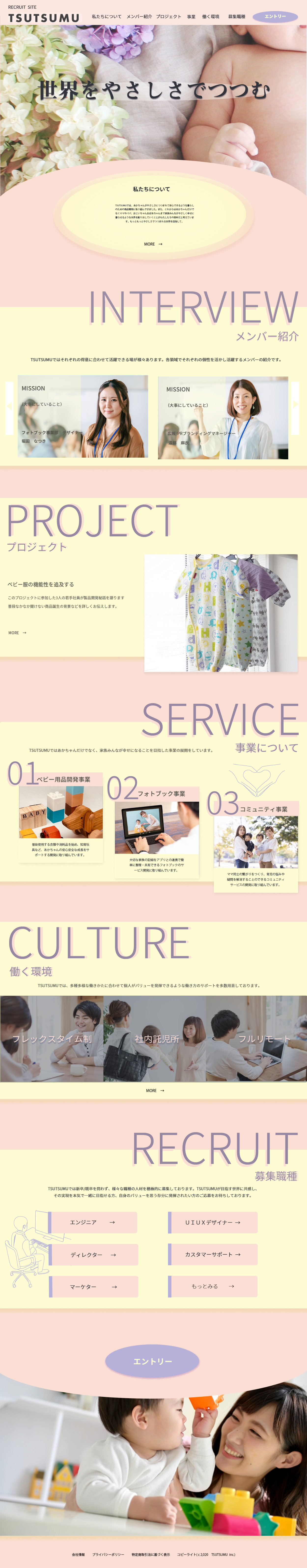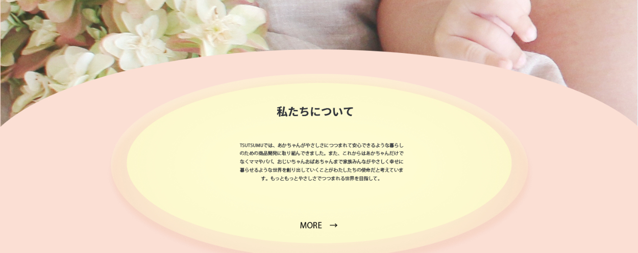 2.「ややさしでつつむ」というコンセプトから配色、メインビジュアルを選定しました。メインビジュアルの赤ちゃんがベージュの布で包まれているように、この採用サイトもベージュの布で全体が包まれているような安心感のあるサイトを意識しました。メインビジュアルのセクションとエントリーセクションに楕円形のオブジェクトを配置することでさらに全体に丸みを作り、優しさを表現しています。