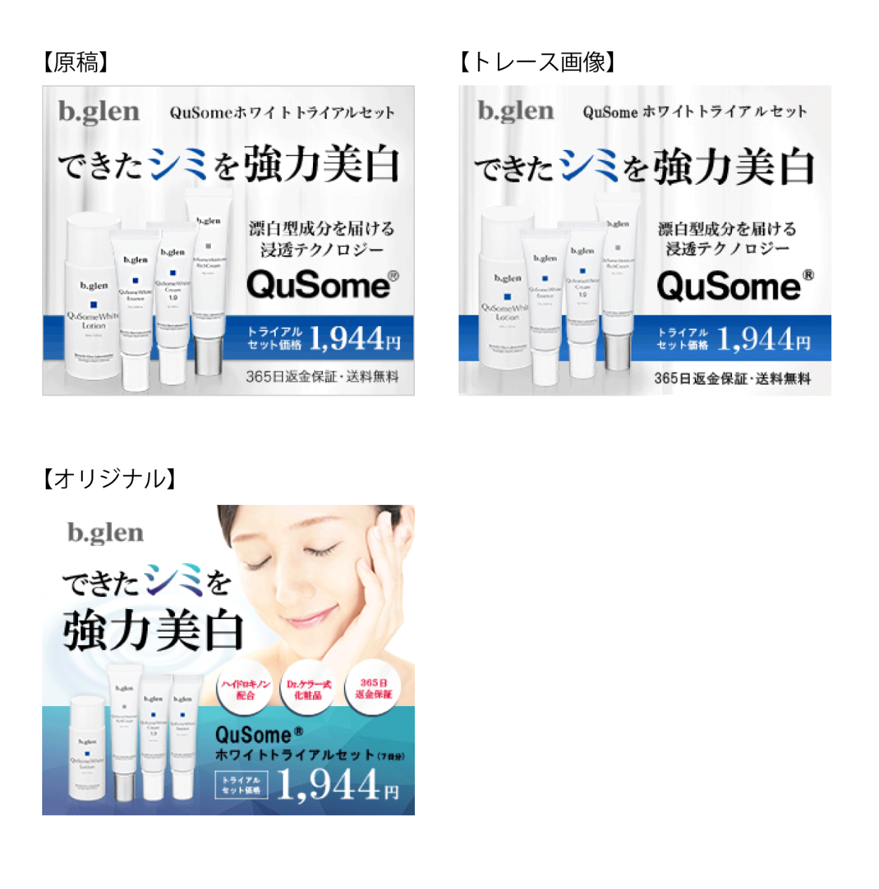「シミ・美白」のキーワードを目立たせ、薬のようなサイエンスのイメージが欲しいと要望があったので、白をベースに青のカラーや背景素材を使用してクライアントの要望に合わせたデザインを適用しました。オリジナルで考える際に、より商品の良さを伝えるため、3つの丸で要点を配置し、視覚で伝えることを意識しました。