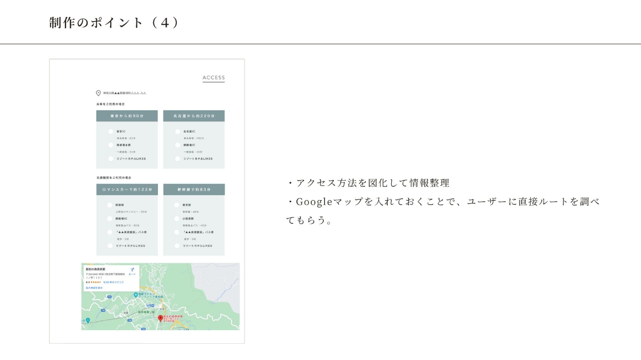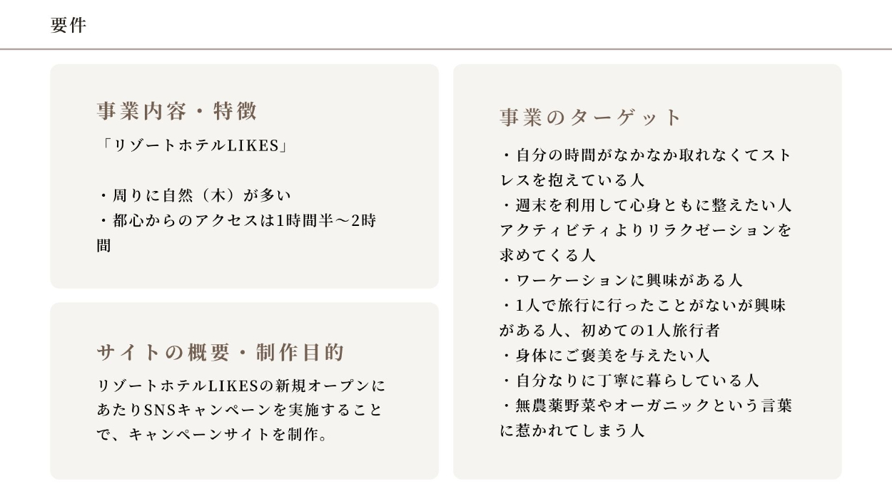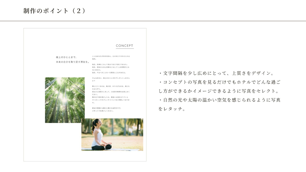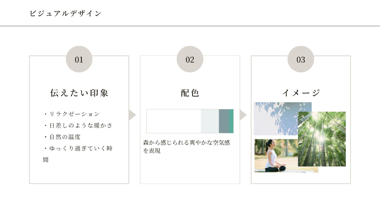 ホテルのイメージから「リラクゼーション、自然の温度、日差し」等のキーワードを抽出し、森の温もりを感じられるような配色を決めました。また、セレクトの写真も自然の温もりが伝わってサイトを見るだけで癒されることを体験できるよう写真セレクトに心かけました。