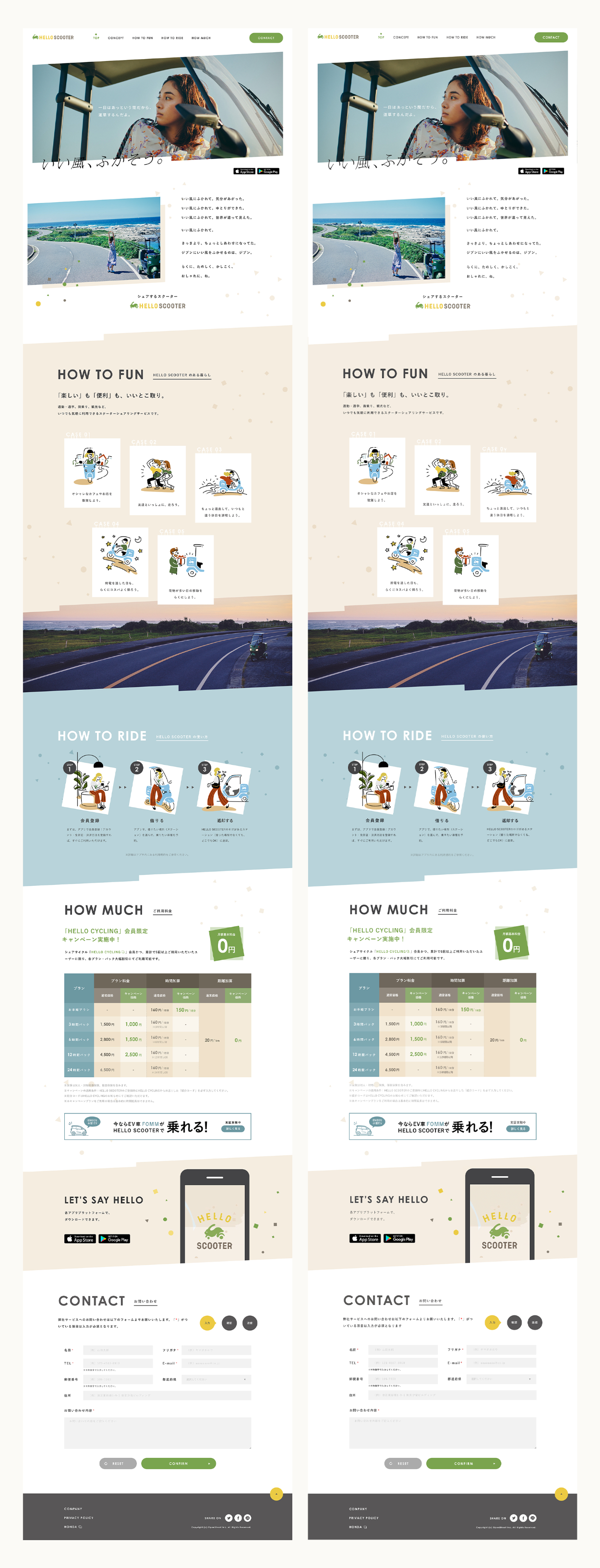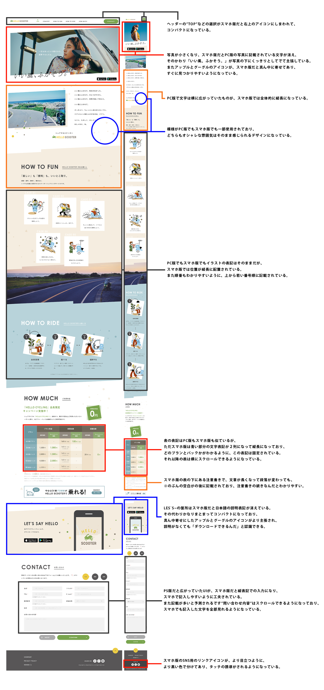 スクーターのサービス、と聞くと男性向けのイメージが強いと思いますが、こちらのWebページでは女性向けにサービスを使用してもらおう、という工夫が見られました。一つ目は女性の写真やイラストが多いこと。二つ目は初めの文章の最後に「おしゃれ」などの女性が好む単語が使われていること。三つ目はデザインの配色がパステルカラーで女性受けが良さそうなこと。主にこの三点女性向けの印象を受けました。このことから、一つの要素でだけでなく、複数の要素でターゲットを引き込むことも必要だと経験できました。