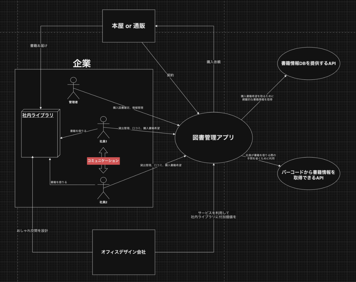 前提③:将来的には本屋または通販と契約して企業と書籍の売り手の中間に立つことや、オフィスデザイン会社と契約してオフィスにおしゃれな社内ライブラリを共に提供することなどを狙っている。