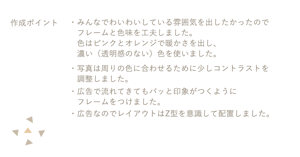 現在このバナーを作ってから少し時間が経っていて、改めてもう一度このバナーを見ていると作っていた時はとてもいいと思っていたのですが、学習を進めていくうちに学ぶことがたくさんたくさんあって、フレームの部分をもう少し工夫してできたのかなと思うのでまたブラッシュアップできればと思います。