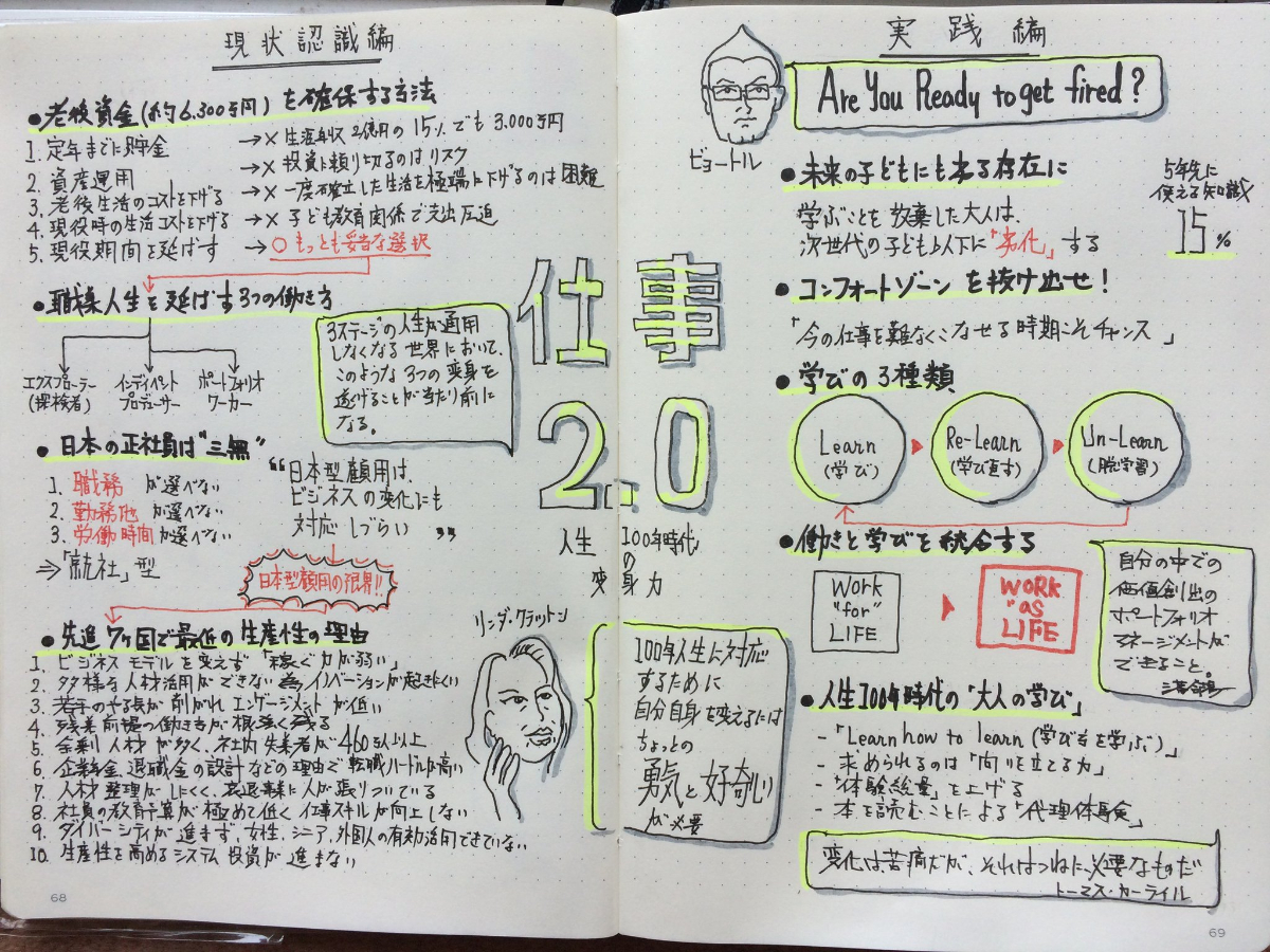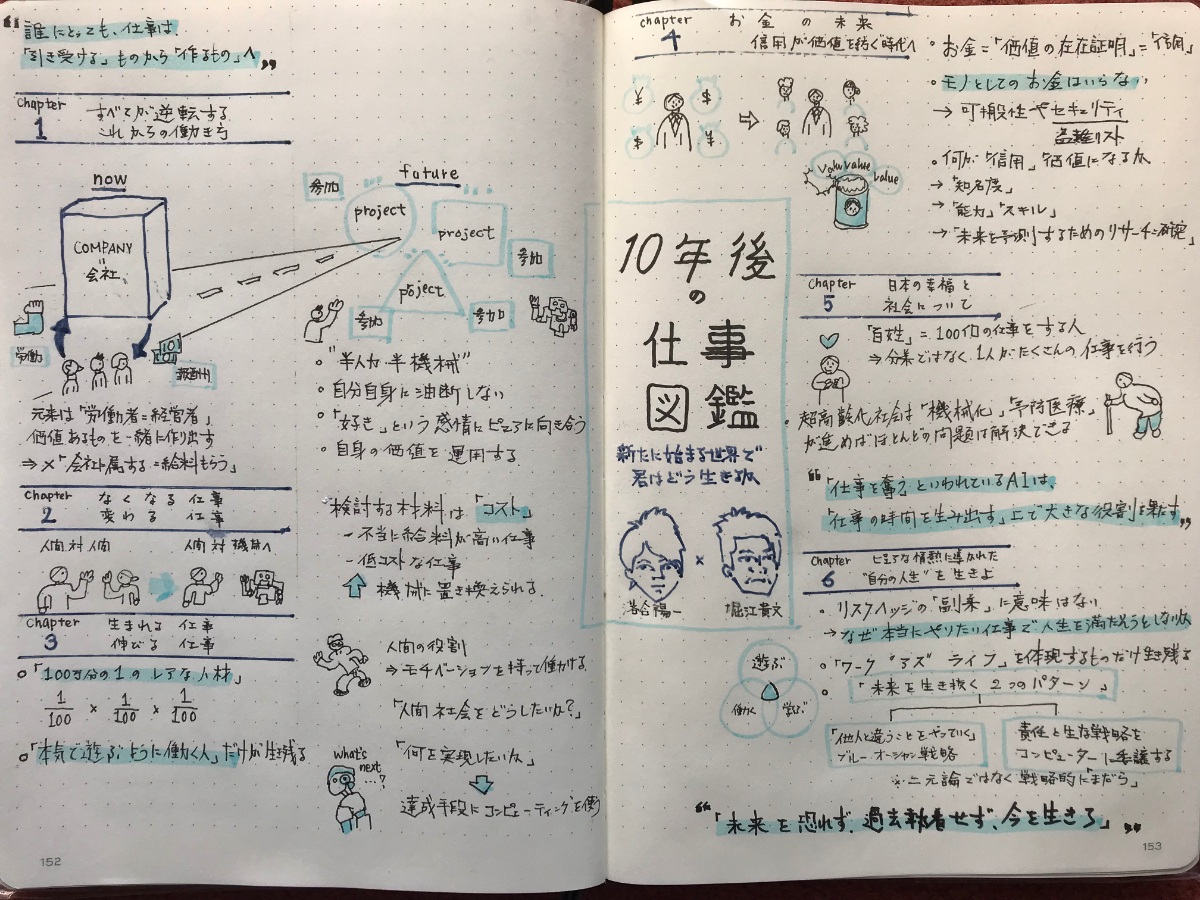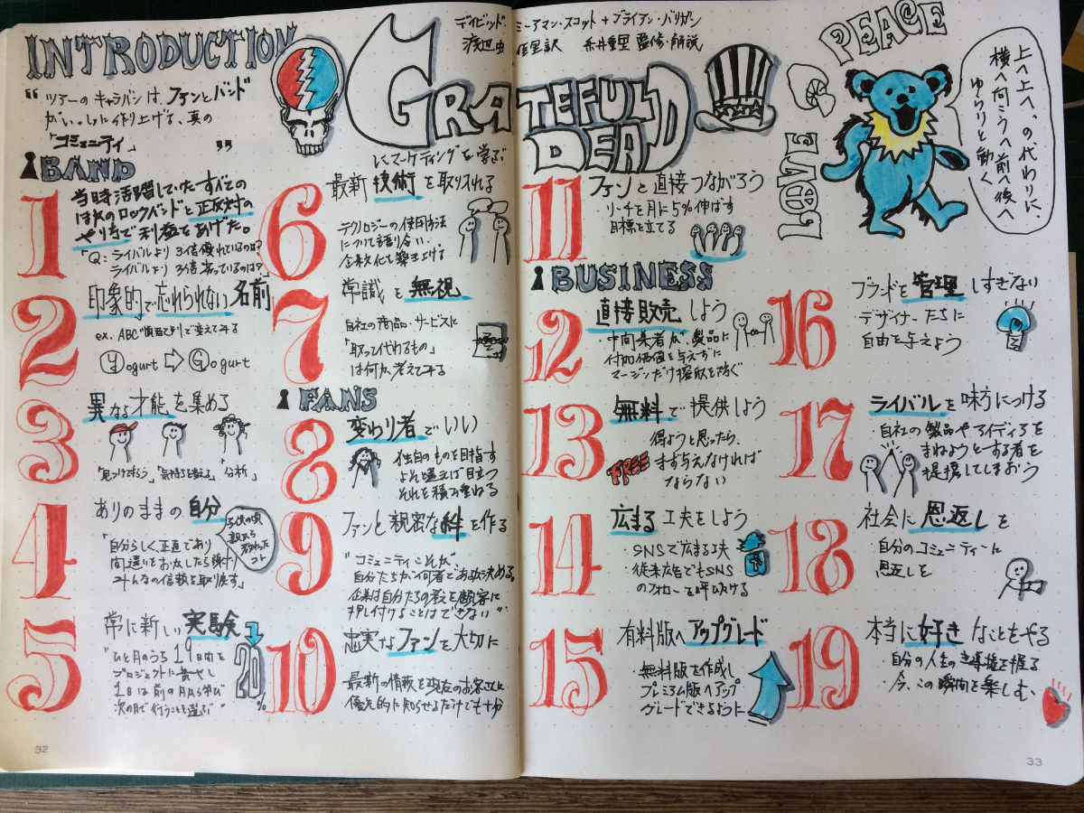 本のスケッチノート ワタナベ / スケッチノート スケッチノートの人 OVERVIEW 本を読んでの自分的サマリをスケッチノートにします 2019.Feb.2 「10年後の仕事図鑑」 落合陽一 × 堀江貴文 2018.Jun.06「グレイトフルデッドにマーケティングを学ぶ」