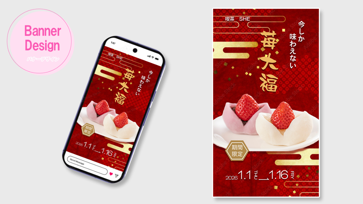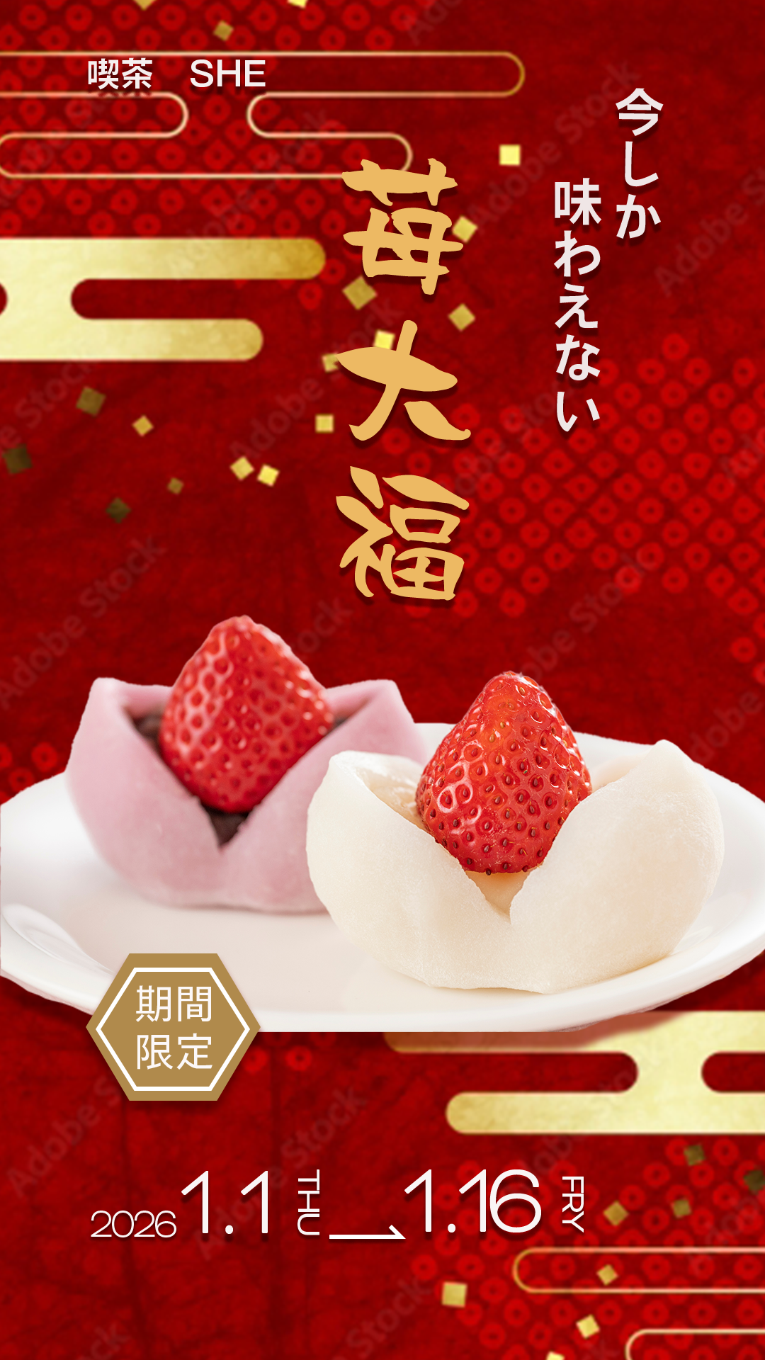 必須項目:「福を分け合う、苺大福」「期間限定」「期間:1/1㈭~1/16㈮」「喫茶SHE」