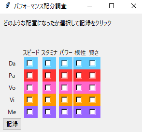 主にpythonのTkinterモジュールを用いて作成し、記録した統計はcsv形式で出力するようにしました。記録する対象によってどのような形式で記録すると使いやすいかは異なります。そのため対象に合わせて入力形式をプルダウン形式やチェックリスト形式と変え、使いやすいUIになることを意識ながら、都度記録ツールを新しく作成しました。