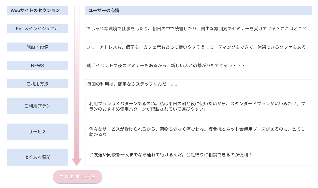 Webサイトを見たペルソナの心情をこのように想定し、情報設計をしています。