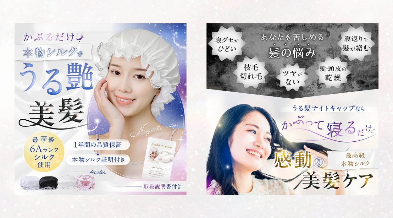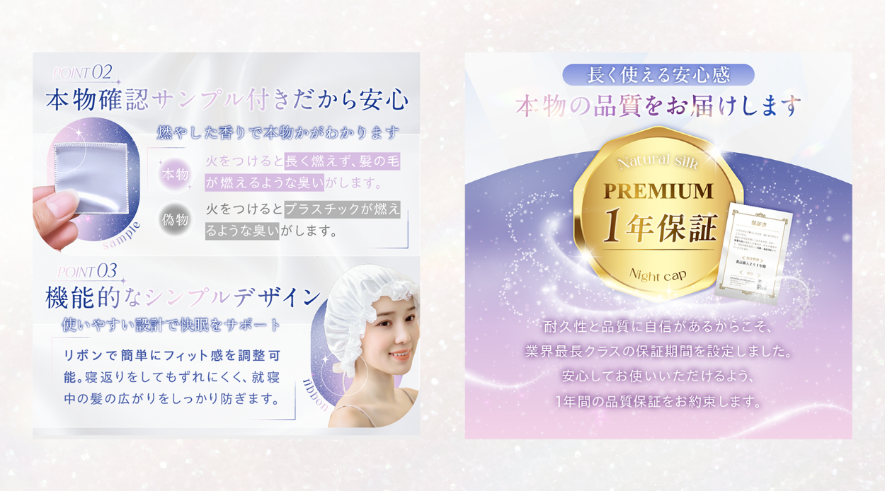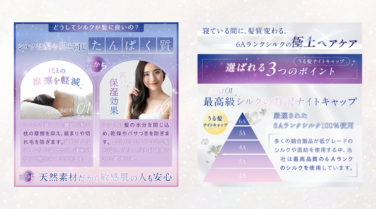 ・「本物シルク」がこの商品のセールスポイントなので、シルク感が伝わるように背景にシルク画像を配置