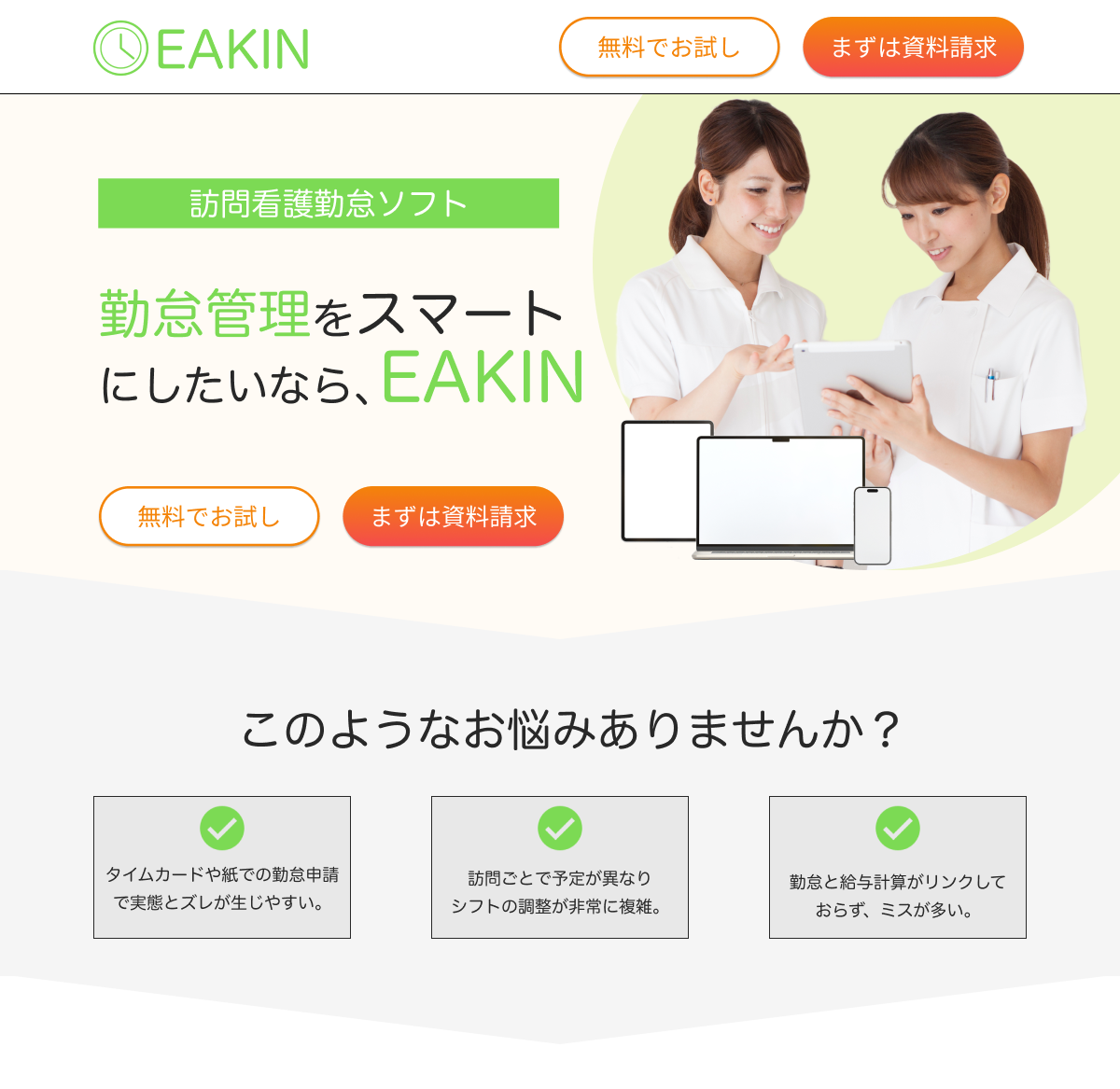 オレンジ、黄緑の2色をメインカラーに展開または、「訪問看護 勤怠ソフト」で検索をして出てくる製品LPをご頂き、競合他社が使っていない色使いでの制作、どちらでもOK