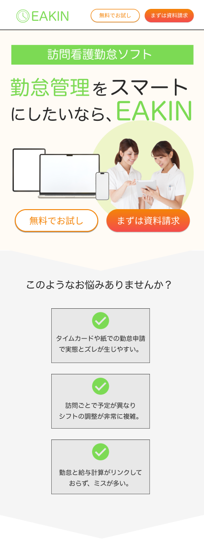 訪問看護業界に特化した勤怠管理ソフトのLP制作についてファーストビューとコンテンツの一部(ファーストビューの直下分コンテンツの一部のみ)のデザインをを募集
