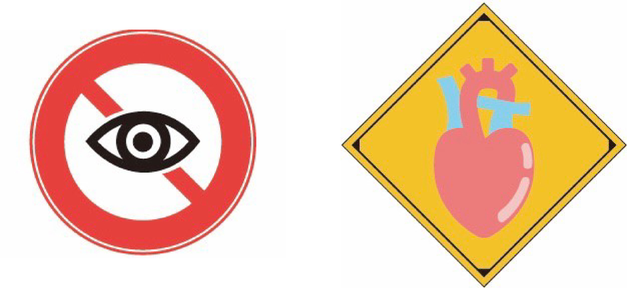 ▽ (左)見るの禁止 /(右)心臓飛び出し注意