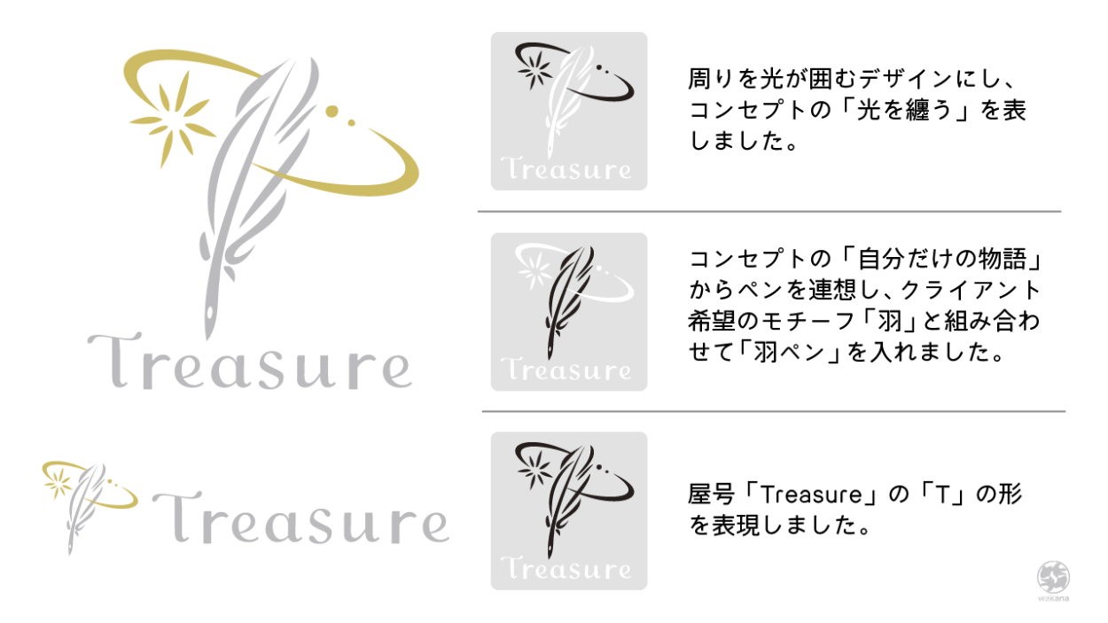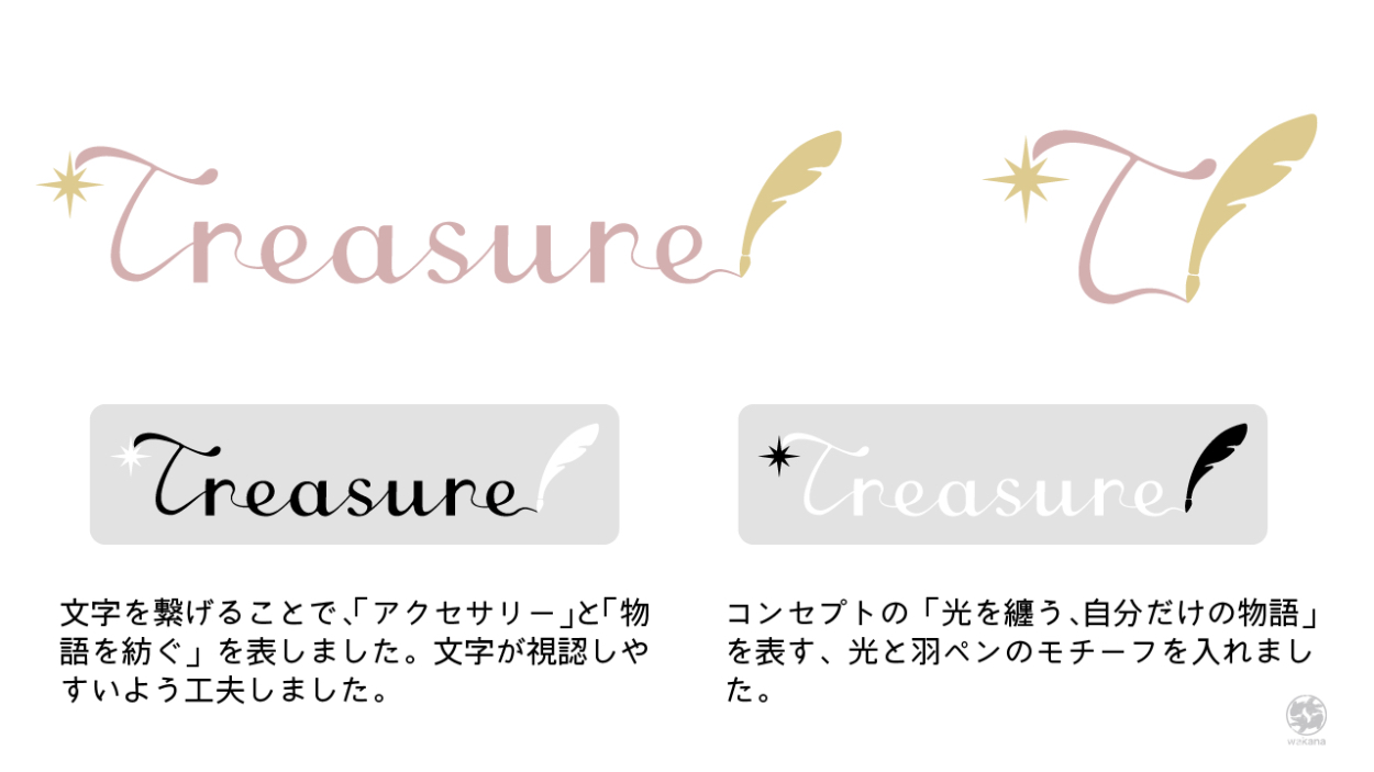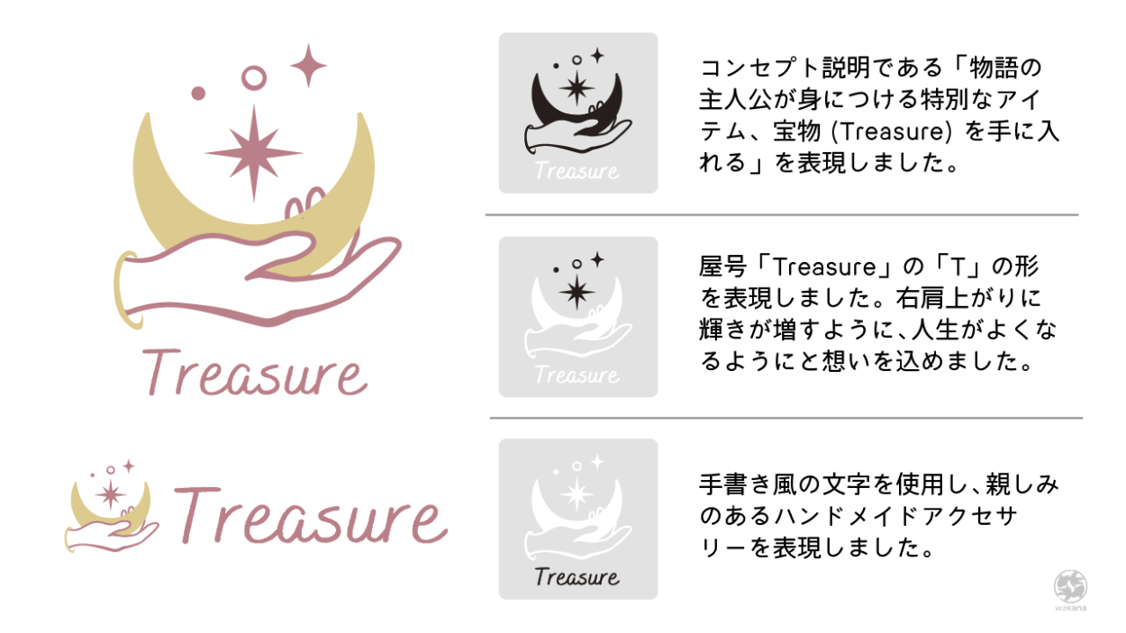 架空のハンドメイドアクセサリーショップ「Treasure」のロゴを作成しました。 【作成時間】各案:1.5〜2時間 【使用ソフト】Adobe Illustrator/ Adobe Photoshop