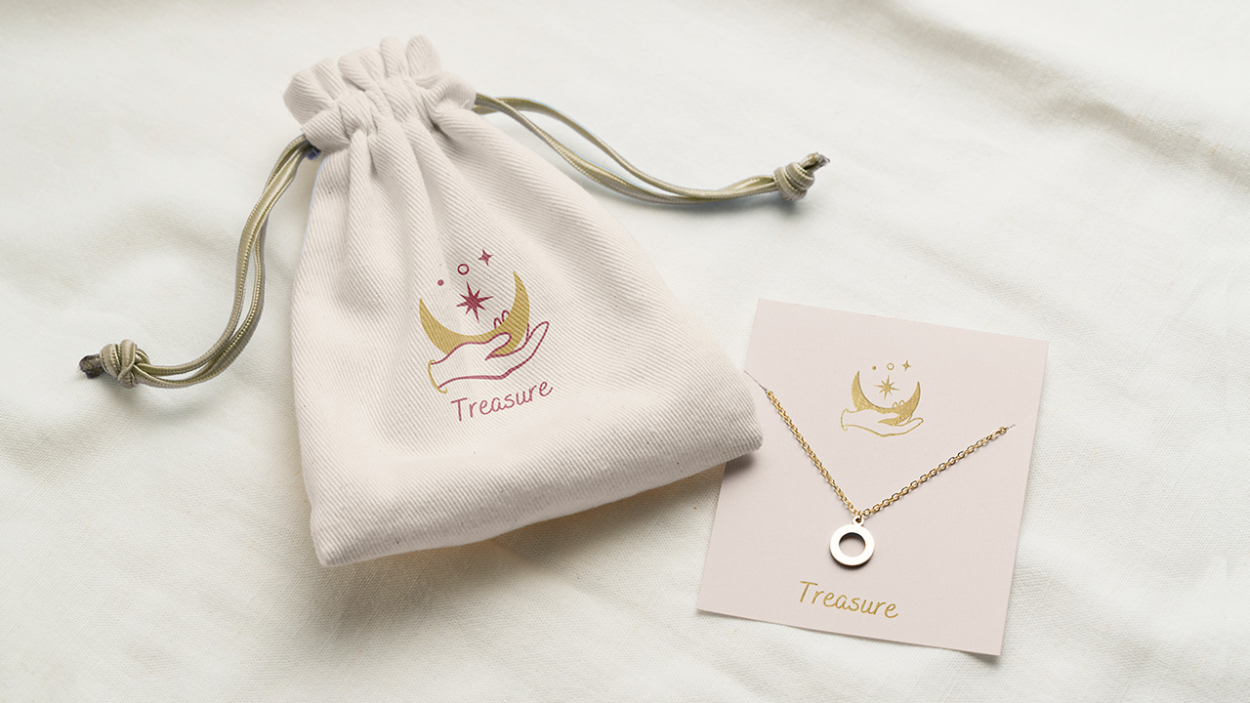 表記:店名のみ、「宝物」という意味モチーフ:星、月、羽根、などカラー:パステルカラー、ゴールドを基調に、可愛らしく上品な印象