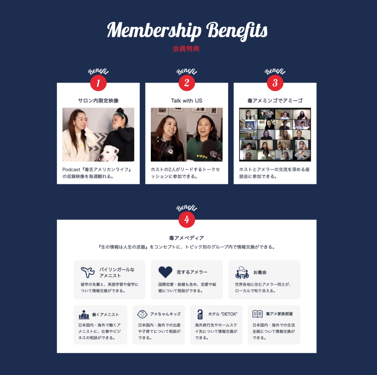 - 閉ざされた空間だからこそ、「サロン内で何をしているのか分からなくて不安」「入会するメリットが分からない」という声が上がりました。会員特典のセクションは、簡潔にまとめながらも詳しく伝えることを意識しました。