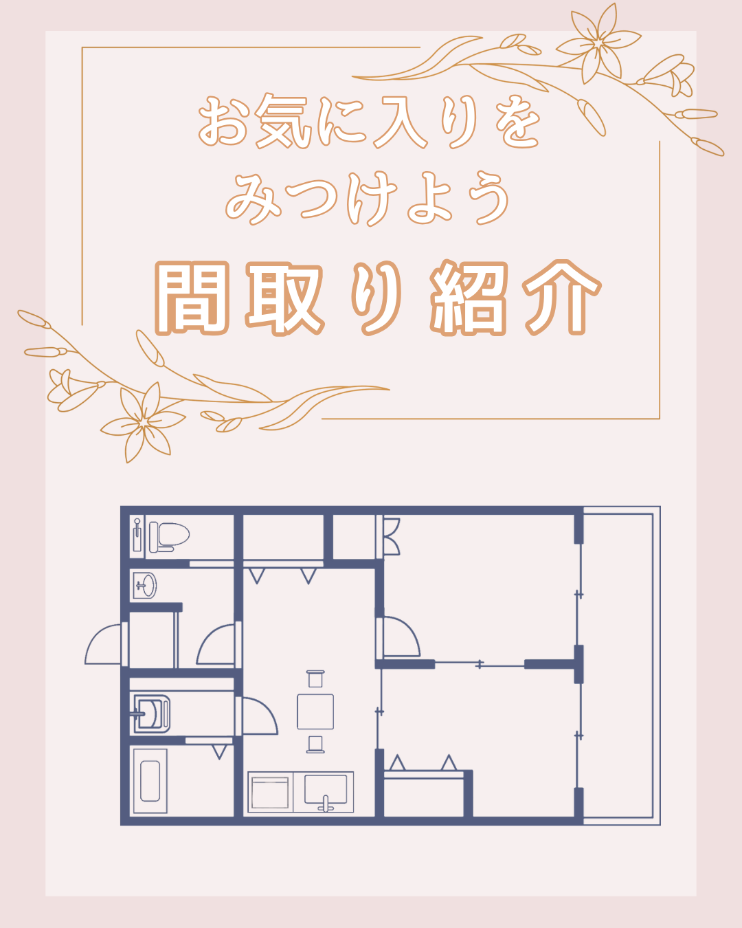 不動産間取りの表紙(バナー) 杉本 美和 webデザイナー シンプルかつ間取りのご紹介用の表紙を作成しました。WEB上でのバナー広告となります。20代~50代向けの女性がターゲットになりますのでカラーは落ち着いた雰囲気に仕上げました。ベース:ピンクメイン:茶色アクセント:紺色
