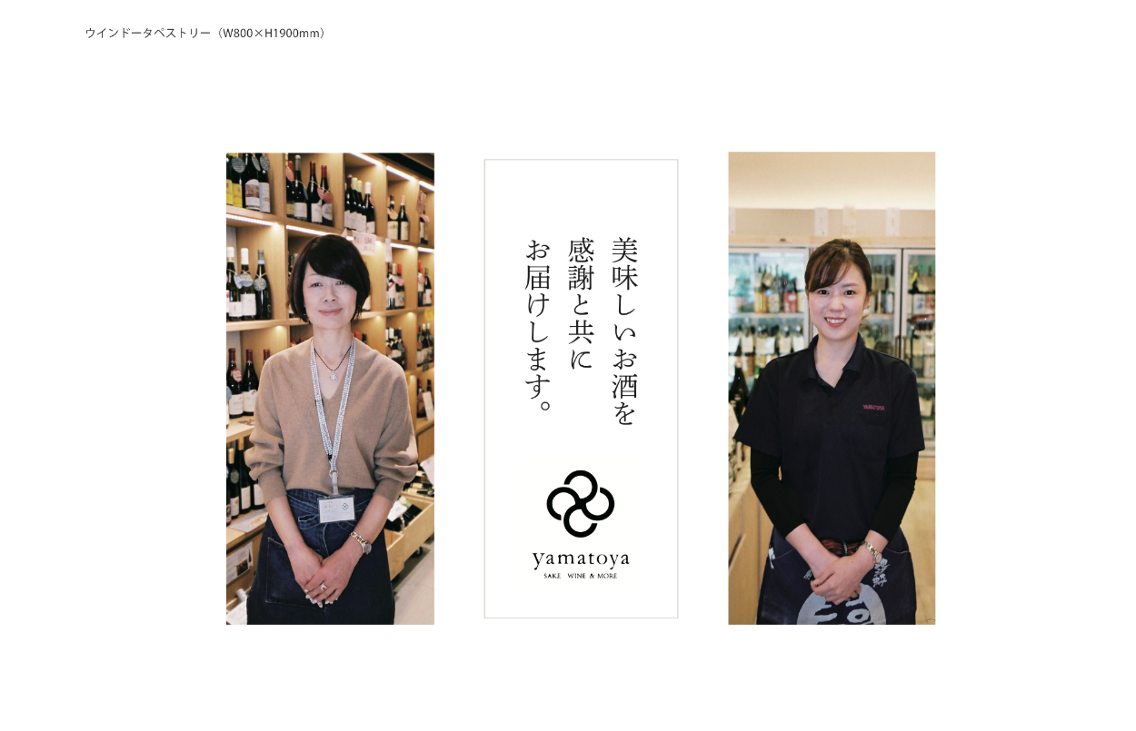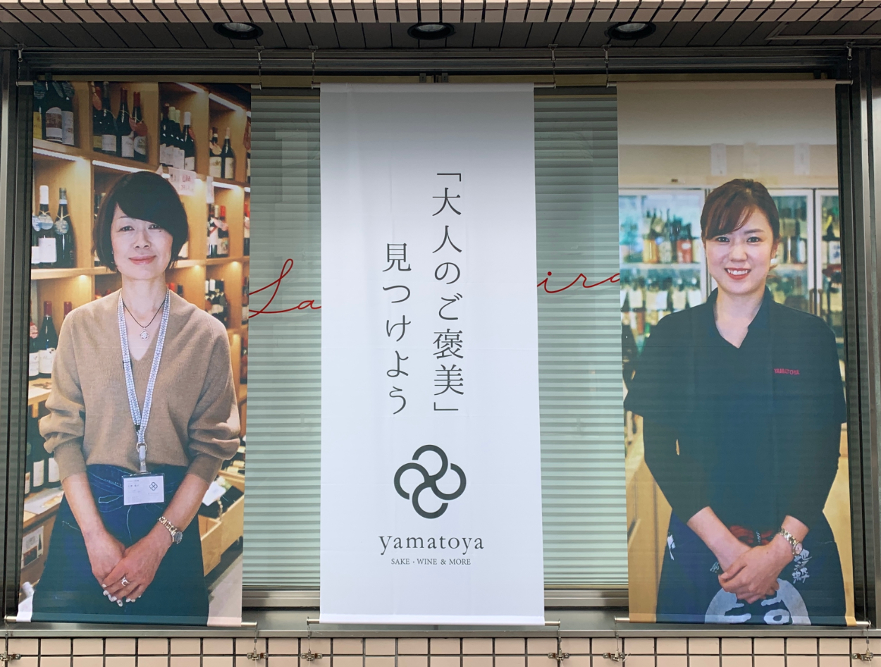 コンセプトは「大和屋酒舗が伝わる屋外広告」です。両サイドに大和屋酒舗とyamatoya winesの店員さんの写真を配置しています。