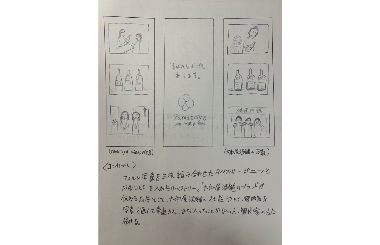 コンセプトは「大和屋酒舗が伝わる屋外広告」です。コンペ形式でゼミの先生と大和屋酒舗のデザイナーの方に審査していただき、20作品以上の応募の中から本選考を通過し、