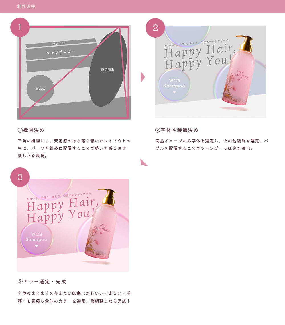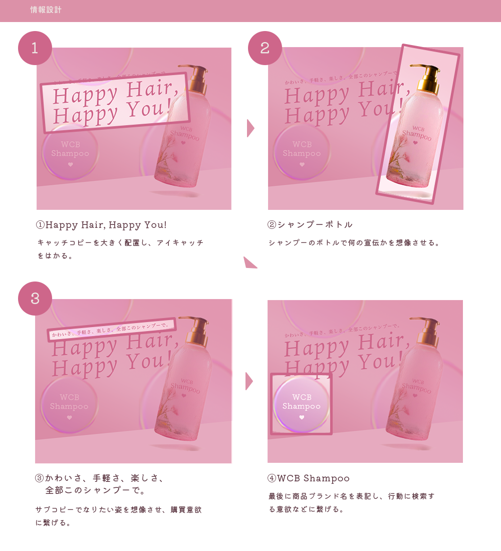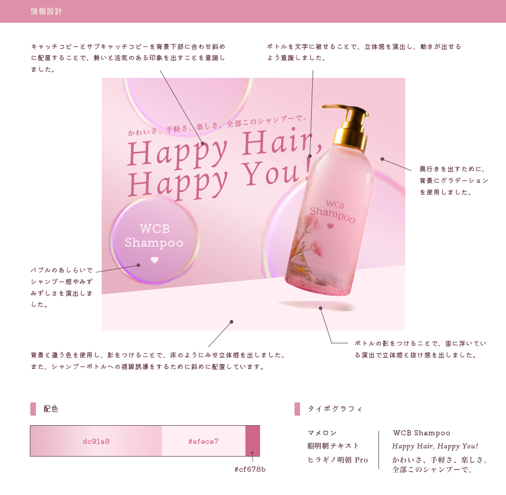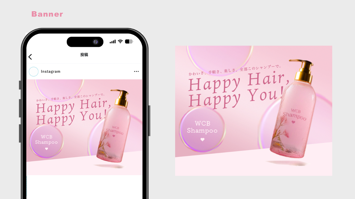 https://www.webcreatorbox.com/blog/banner-design-10 の 架空案件で新商品シャンプーのバナー制作をしました。