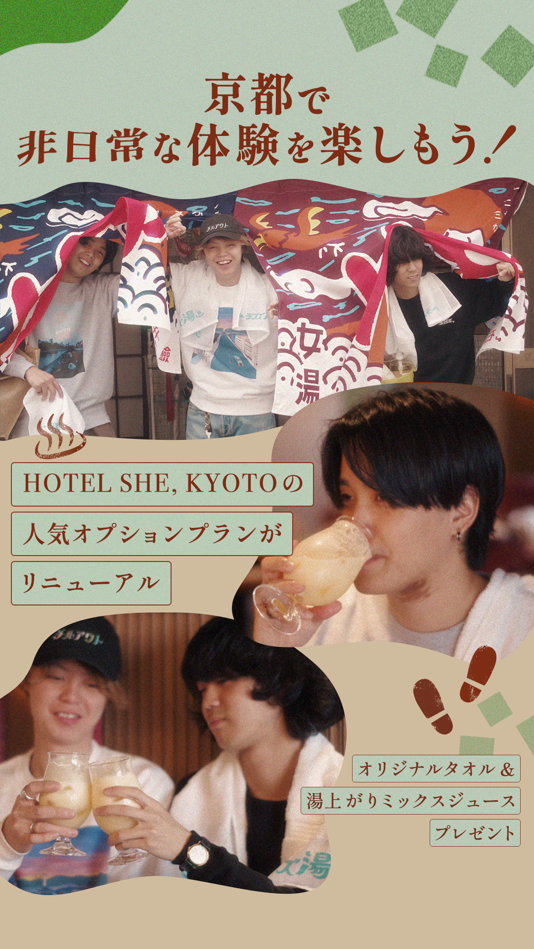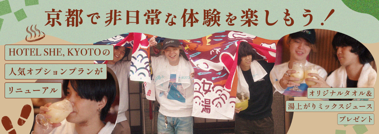 HOTEL SHE, KYOTOのバナー制作に取組みました。目的は、リニューアルした銭湯プランの認知拡大、プロモーションです。(制作期間:約1週間※他3案検討時間含む)
