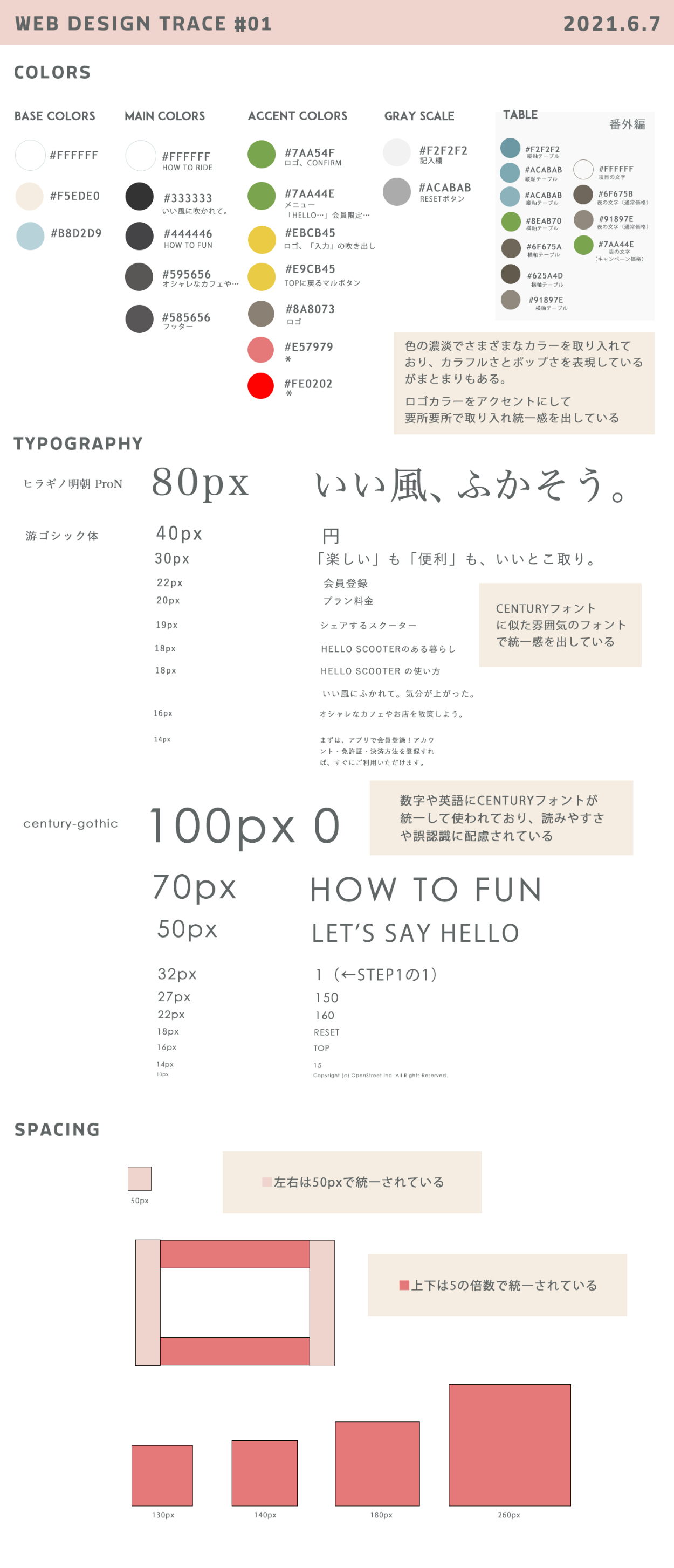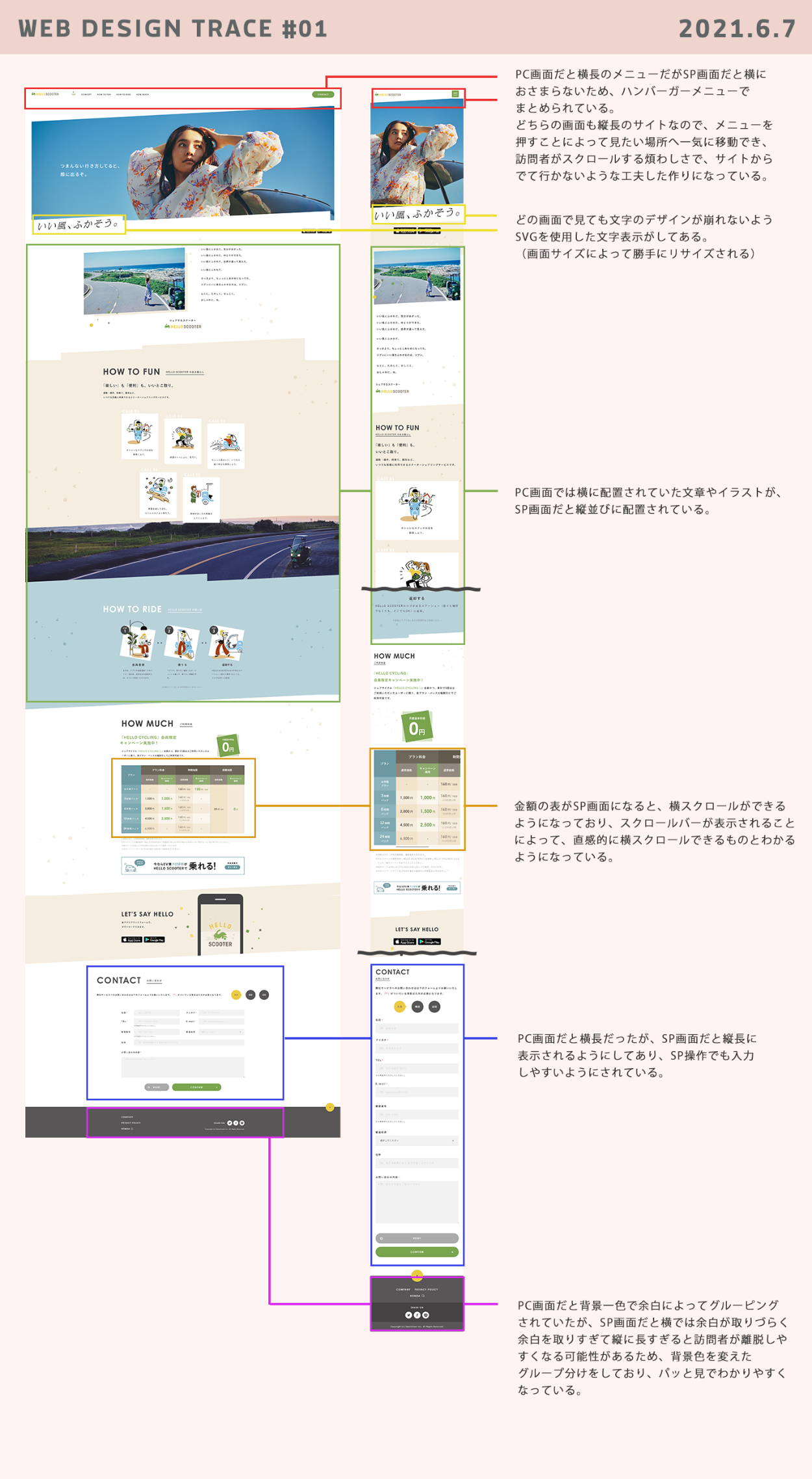 既存LPサイトのトレースを通して、スタイルガイドを作成し考察・分析、PC・S Pのデバイスによるレイアウトの変化を考察・分析しました。