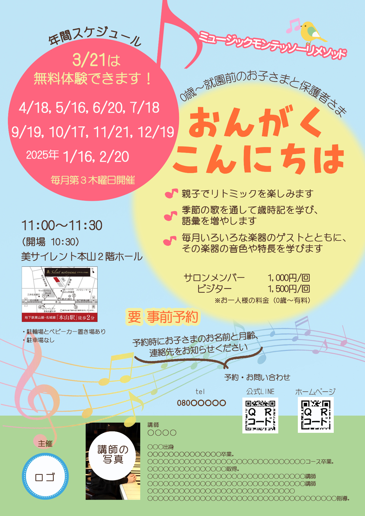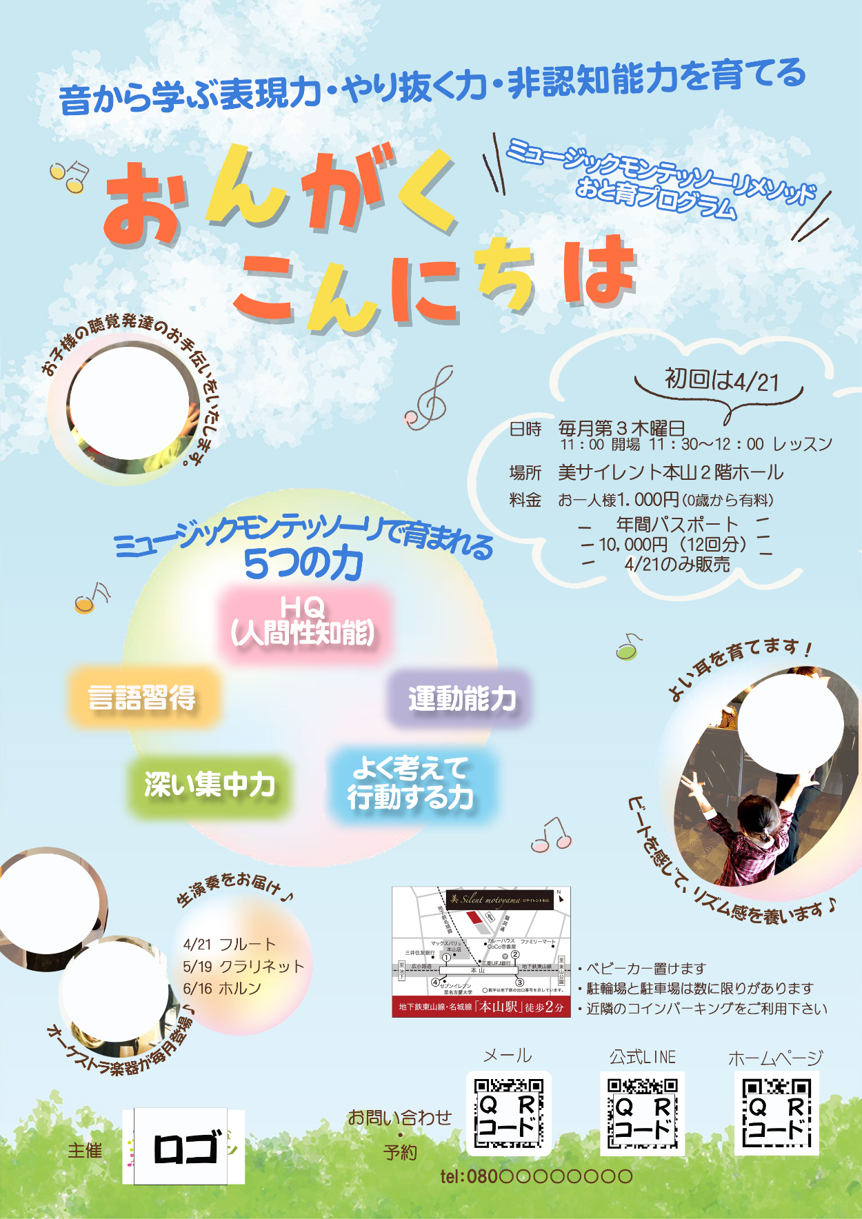 Music Montesori Academy様の出前講座の告知フライヤーを毎年制作させていただいております。
