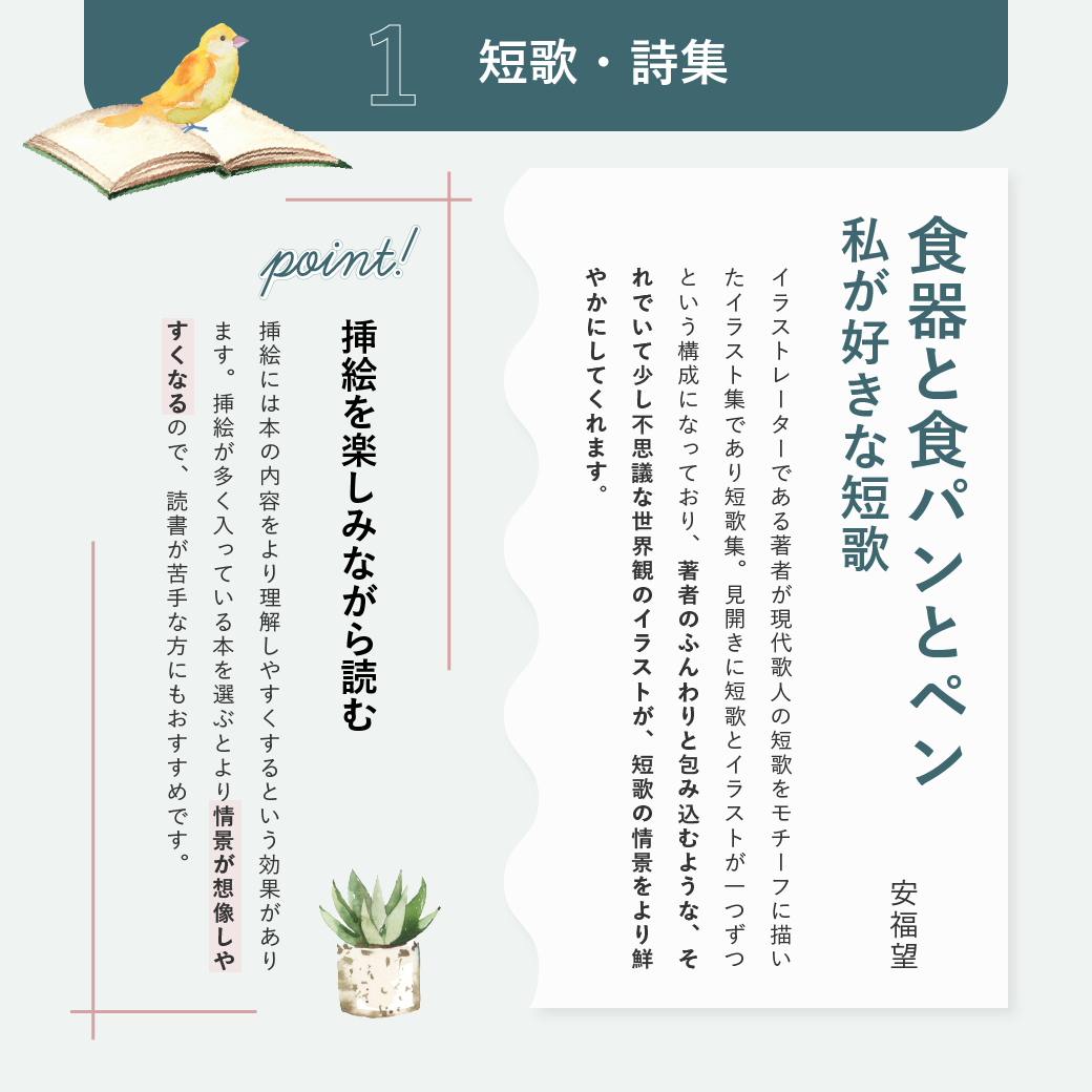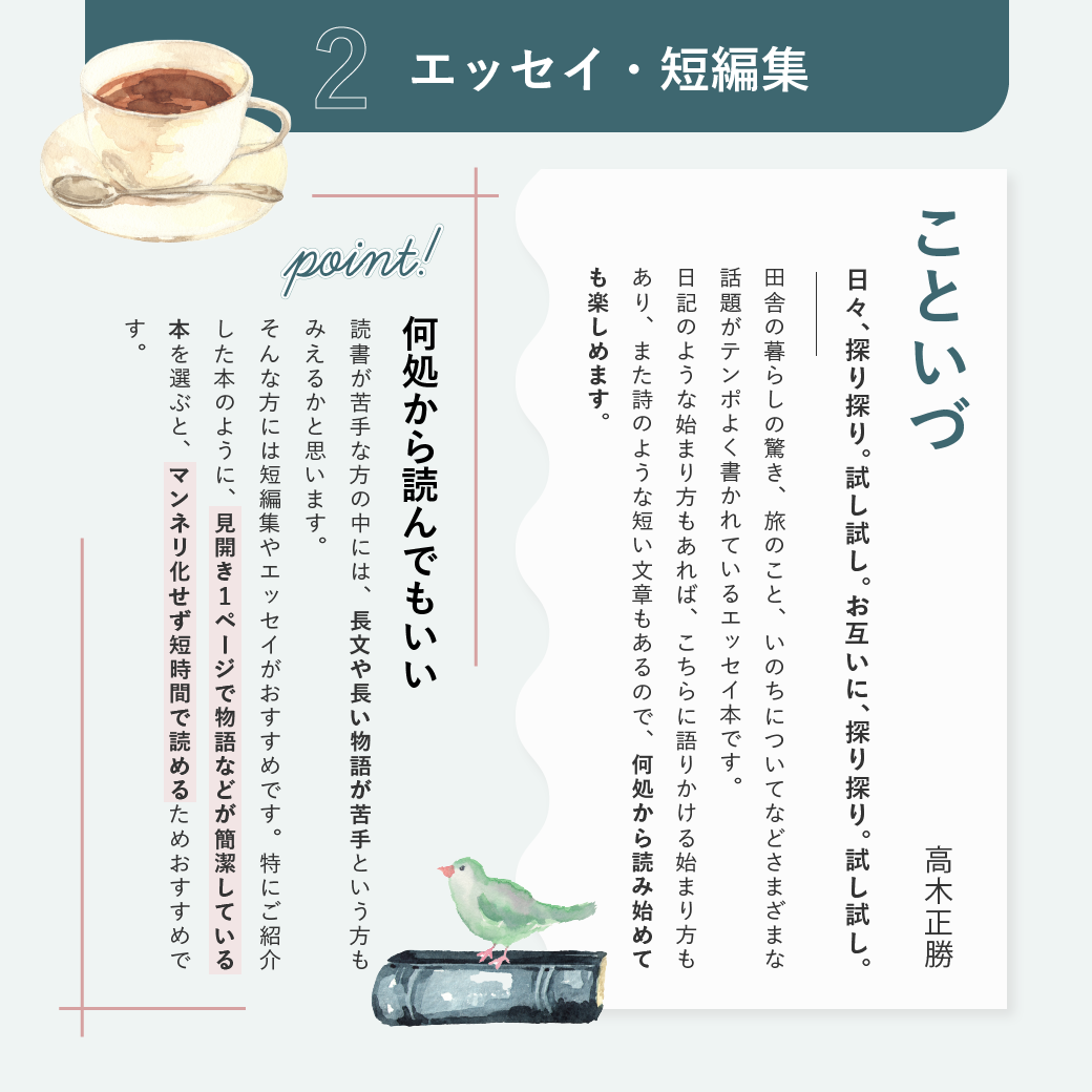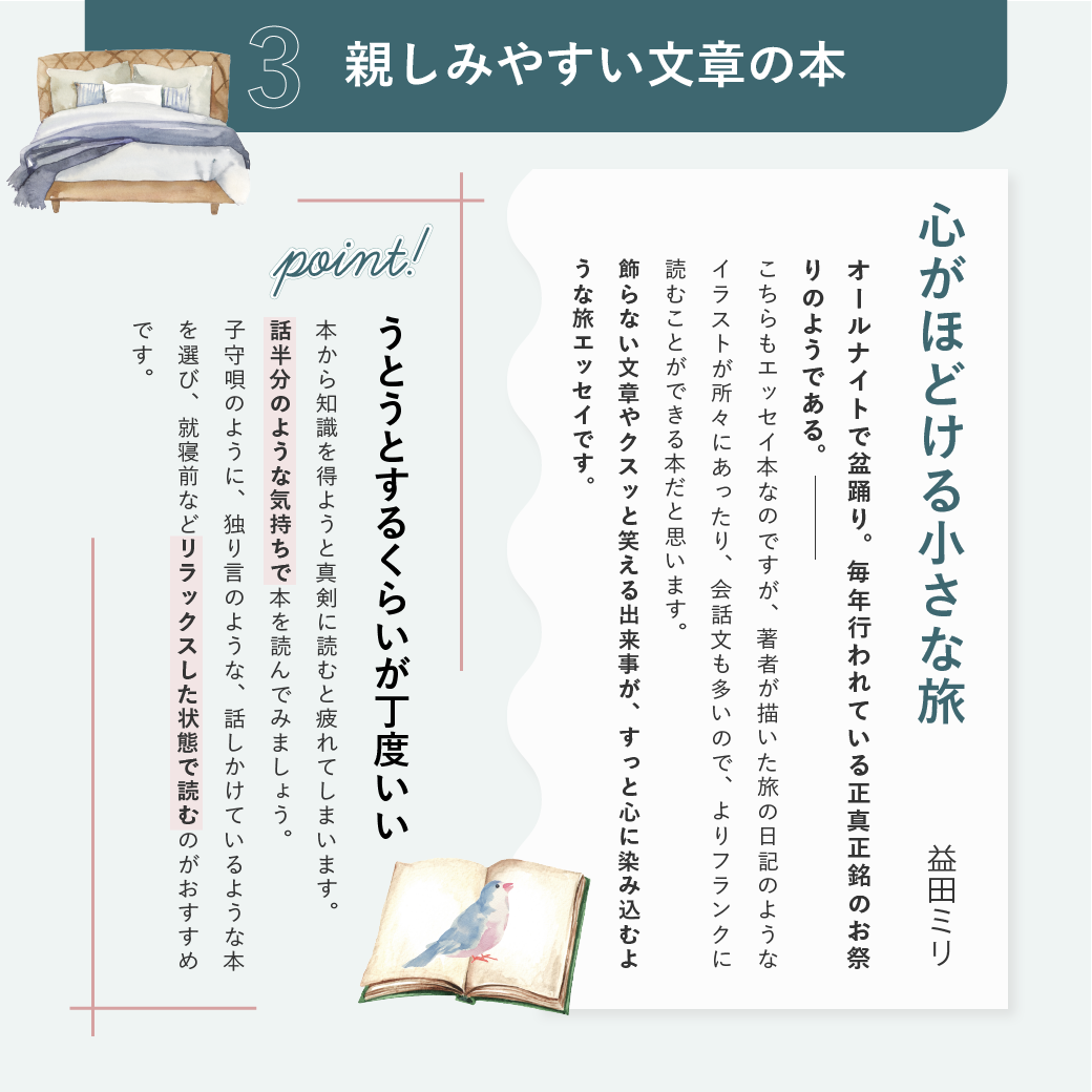 2-5枚目に小鳥のイラストを使用することで、統一感を持たせました。また、3-5枚目は本のイラストと組み合わせて配置することで、より本に親近感を持ってもらえる様なデザインにしました。