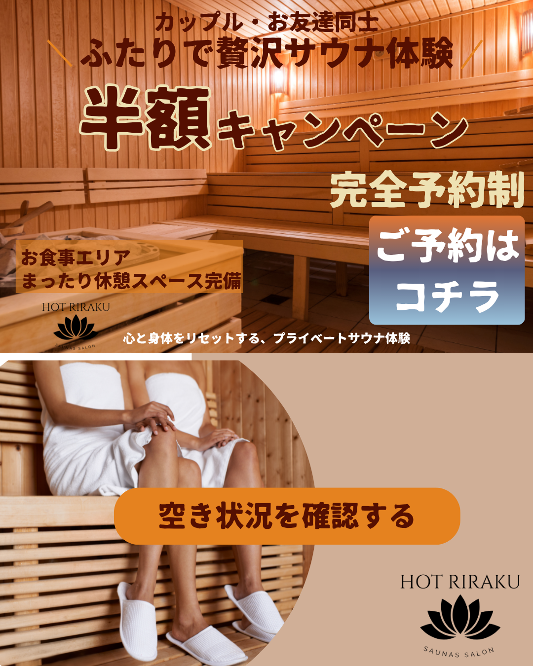 男女別エリアや個室完備をしているサウナサロンのクライアントさんなので、リラックスや落ち着き感のある印象でターゲットが興味を引くように、シンプルで訴求できる素材を選びました。