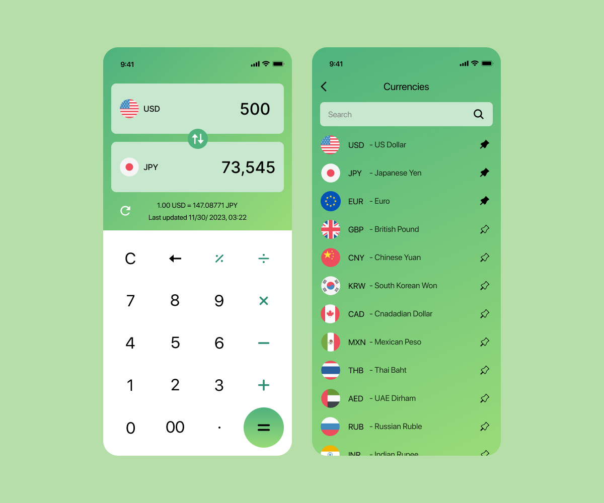 ・通貨リストはよく使うものをピンでとめリストの上部に固定できる機能を加え、ユーザーがスムーズに通貨の選択をできるようにしました。