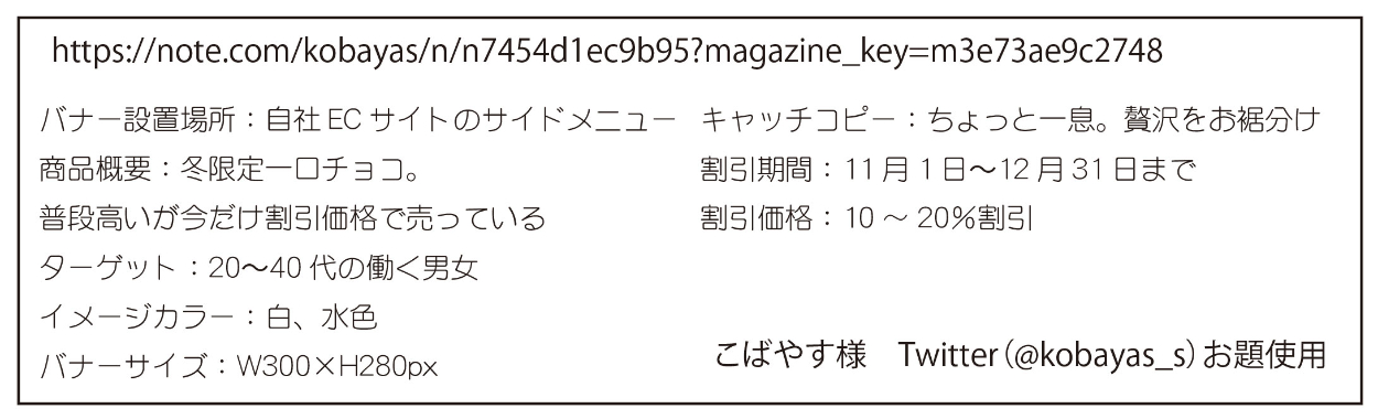 https://note.com/kobayas/n/n7454d1ec9b95?magazine_key=m3e73ae9c2748 こばやす様 Twitter(@kobayas_s)お題使用した、架空バナーです。