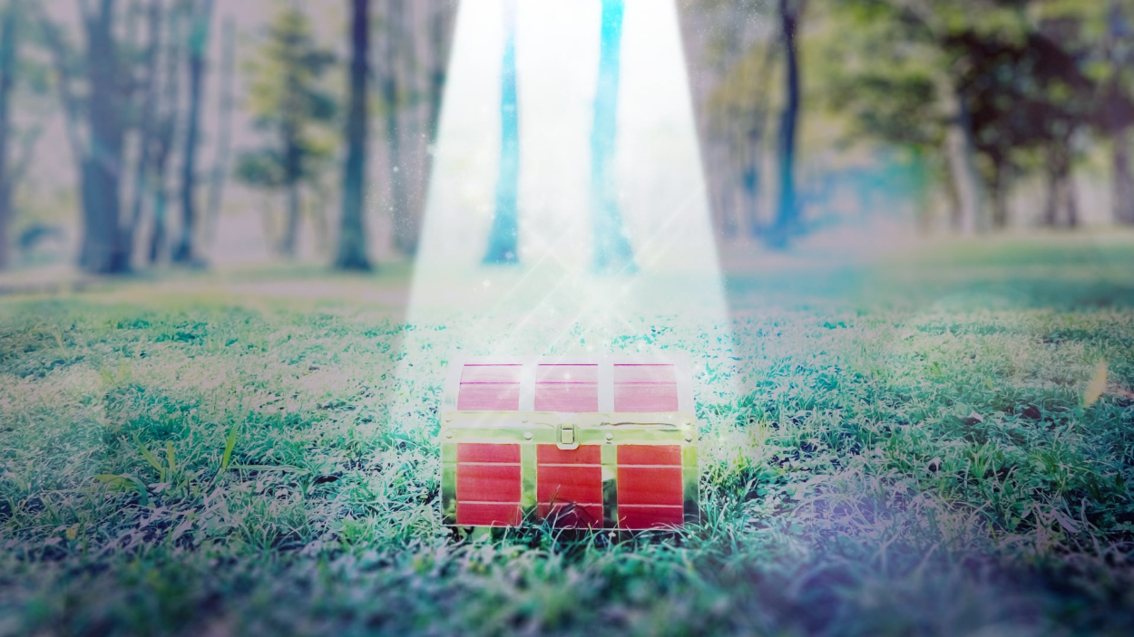 ゲーム風の宝箱の写真(https://www.pakutaso.com/20161250356post-9891.html)に、宝箱へのスポットライト、玉ボケの追加、テキストの可読性を上げるために背景の一部のぼかし加工を行いました。