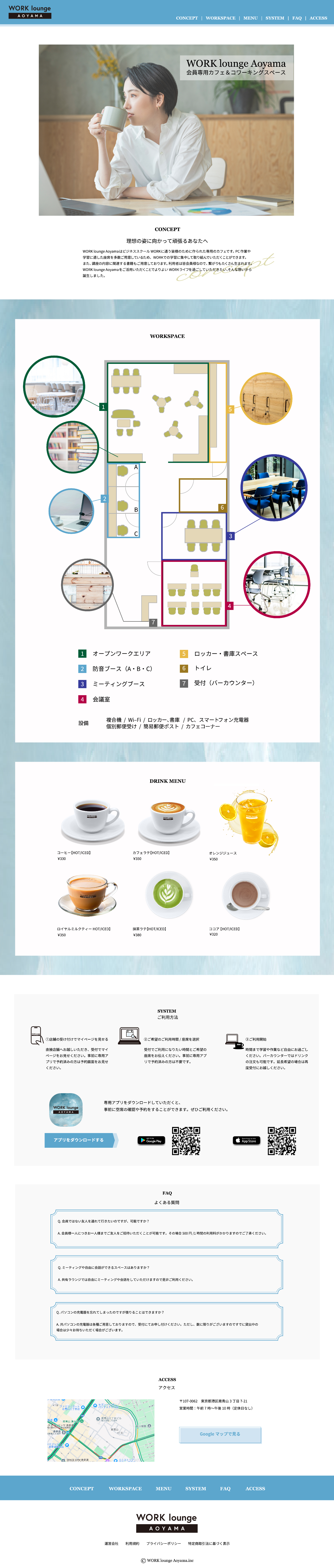 SHElikes MULTI CREATOR COURSE Designerにて、架空案件として会員様限定のカフェ&コワーキングスペースをオープンするため、利用方法やアクセス情報を載せたWebサイト制作依頼