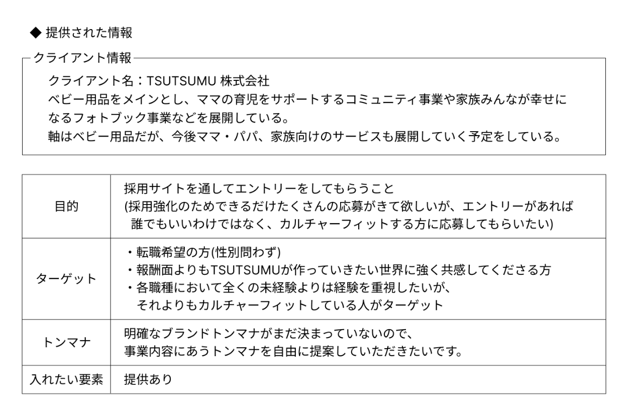 提供された課題要件を自分なりに噛み砕き、目的とターゲットを設定しました。