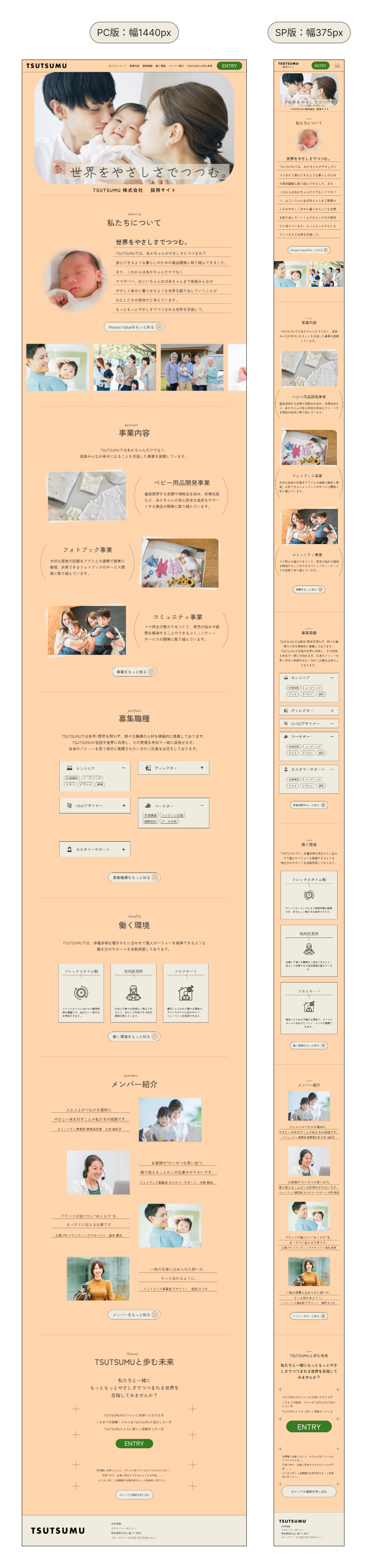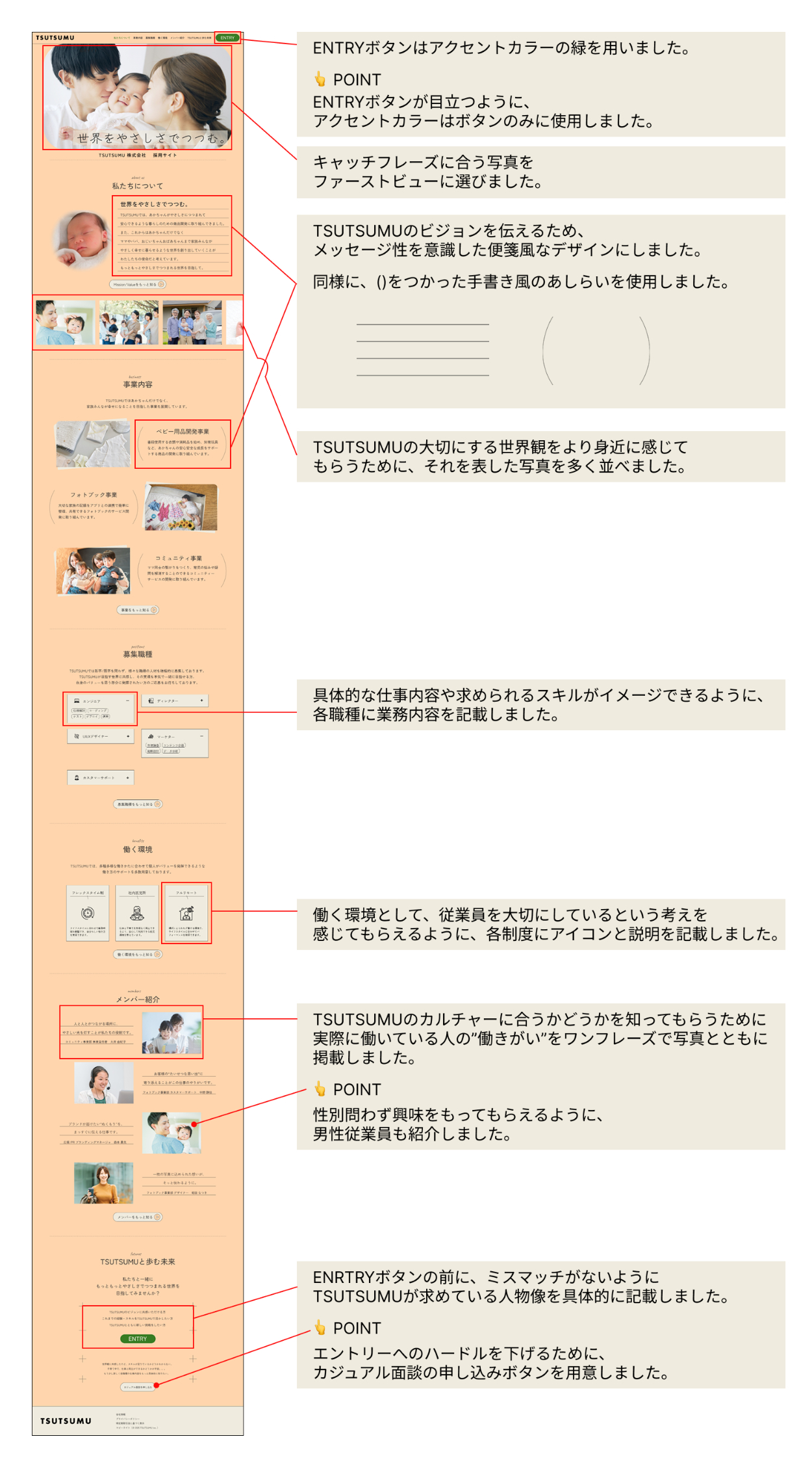 - Webサイトの目的を理解することで、各セクションに掲載する内容を精査することができました。特に、今回の要件ではコーポレートサイトと採用サイトの目的の違いを意識することで、求職者が求めている情報を掲載することができました。