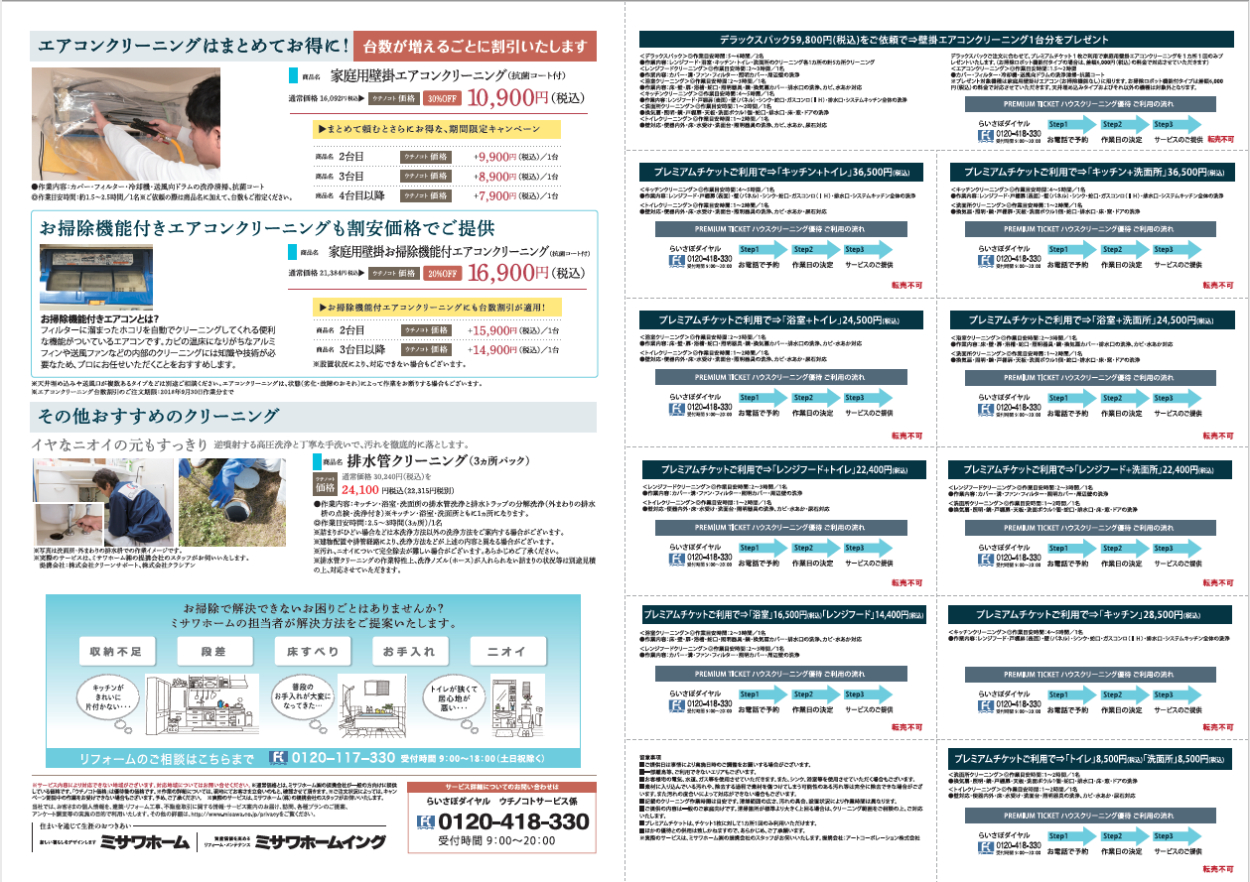 親しみやすいデザインが多かったハウスクリーニング関連のリーフレットでしたが、クライアントの依頼で高級なイメージでとのことだったので印刷する紙にもこだわり、マットでおちついた高級紙で印刷したので想像通りの高級感がでました。