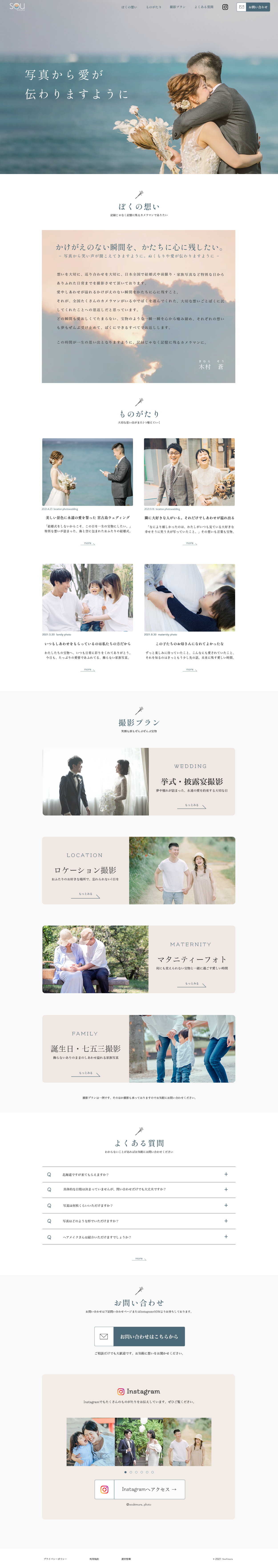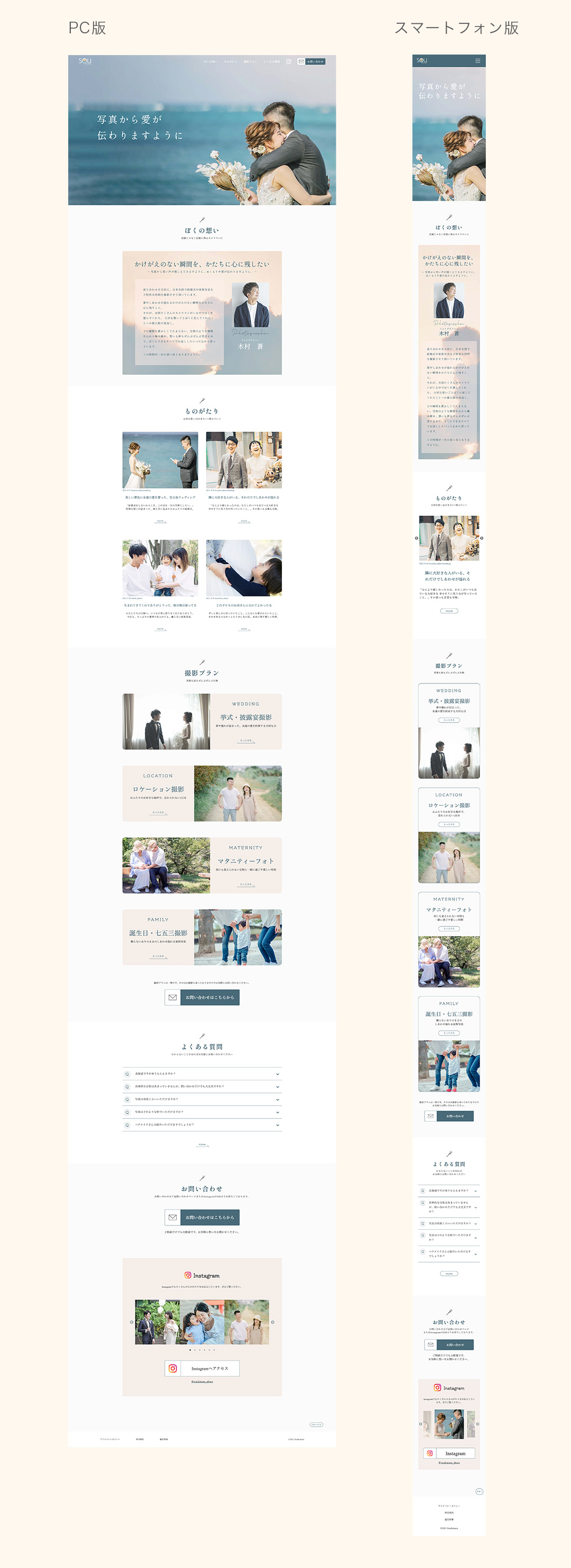 女性向けキャリアスクールSHElikesデザインコースの卒業制作として、要件定義からデザイン制作、コーディング(HTML/CSS/jQuery)まで行いました。結婚式の際にお世話になったフォトグラファー様をお客様としてイメージし、TOPページ部分のみ制作しました。