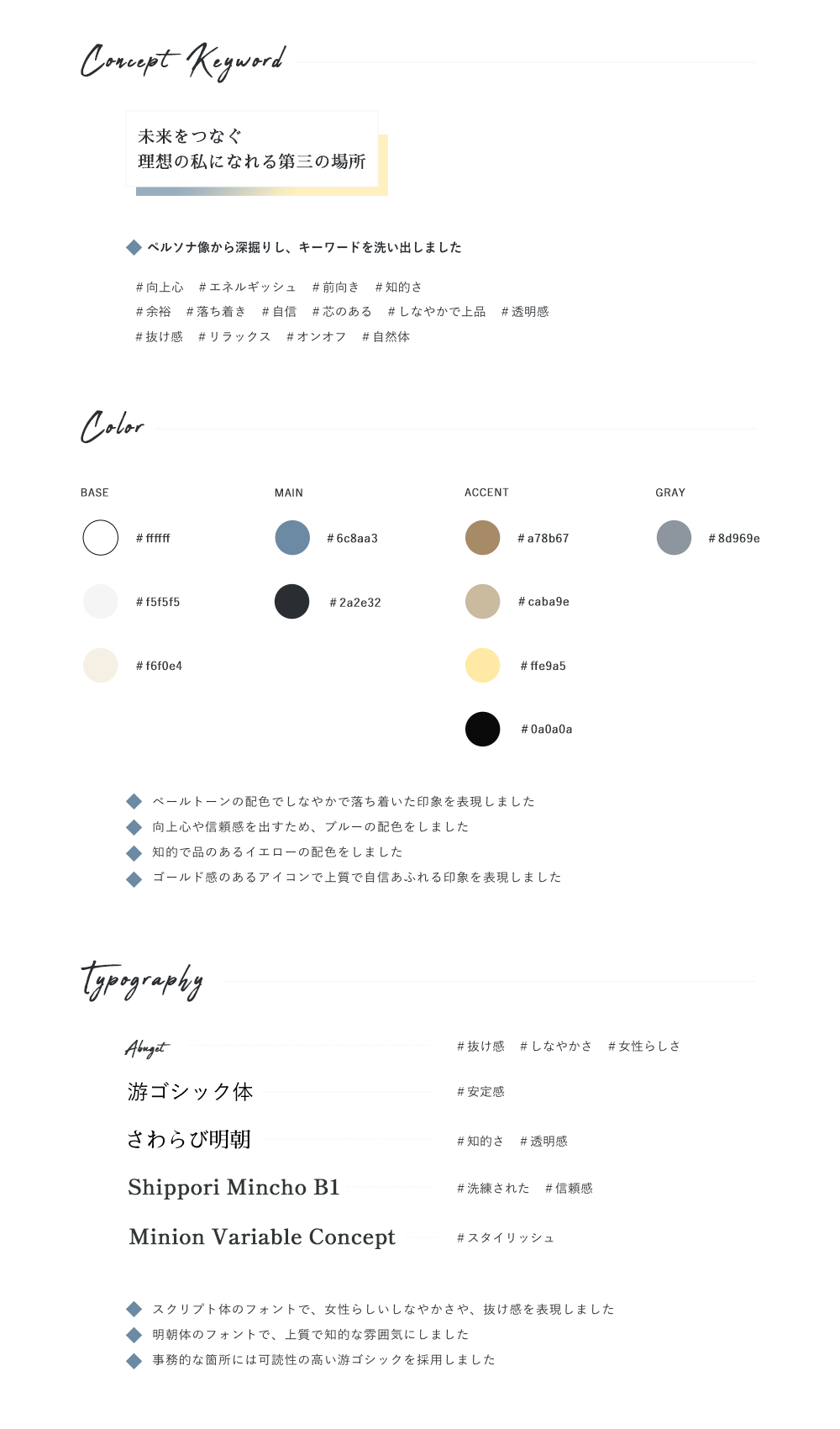 フォントや配色、余白間が持つイメージをしっかりと理解した上で選択することの重要性を感じました。また、なぜその選択をしたのかを言語化することで、制作したLPに深みが増してより伝わりやすいデザインになることを学びました。
