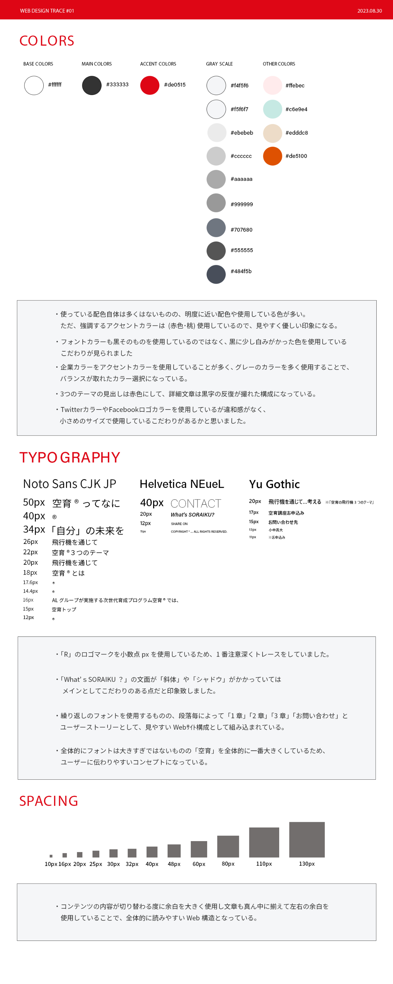 WEBサイトが元から横幅を大きく取られていることから、選択された課題の中で「余白」の練習になるのは、このWEBサイトではないかと思い、選択したきっかけでもありました。文字のフォントも大きさによっては文字間の余白も異なるため、見本と何度も見比べながらトレースいたしました。
