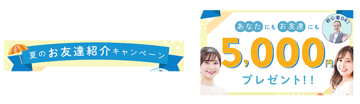 プレゼントキャンペーンであることが一目でわかるよう、最も目立つ情報にプレゼント風のあしらいを用いました。「お友達紹介キャンペーン」にリボン型の座布団を引いたり、「5,000円プレゼント」の部分にギフトカード風の背景を用いたりしました。