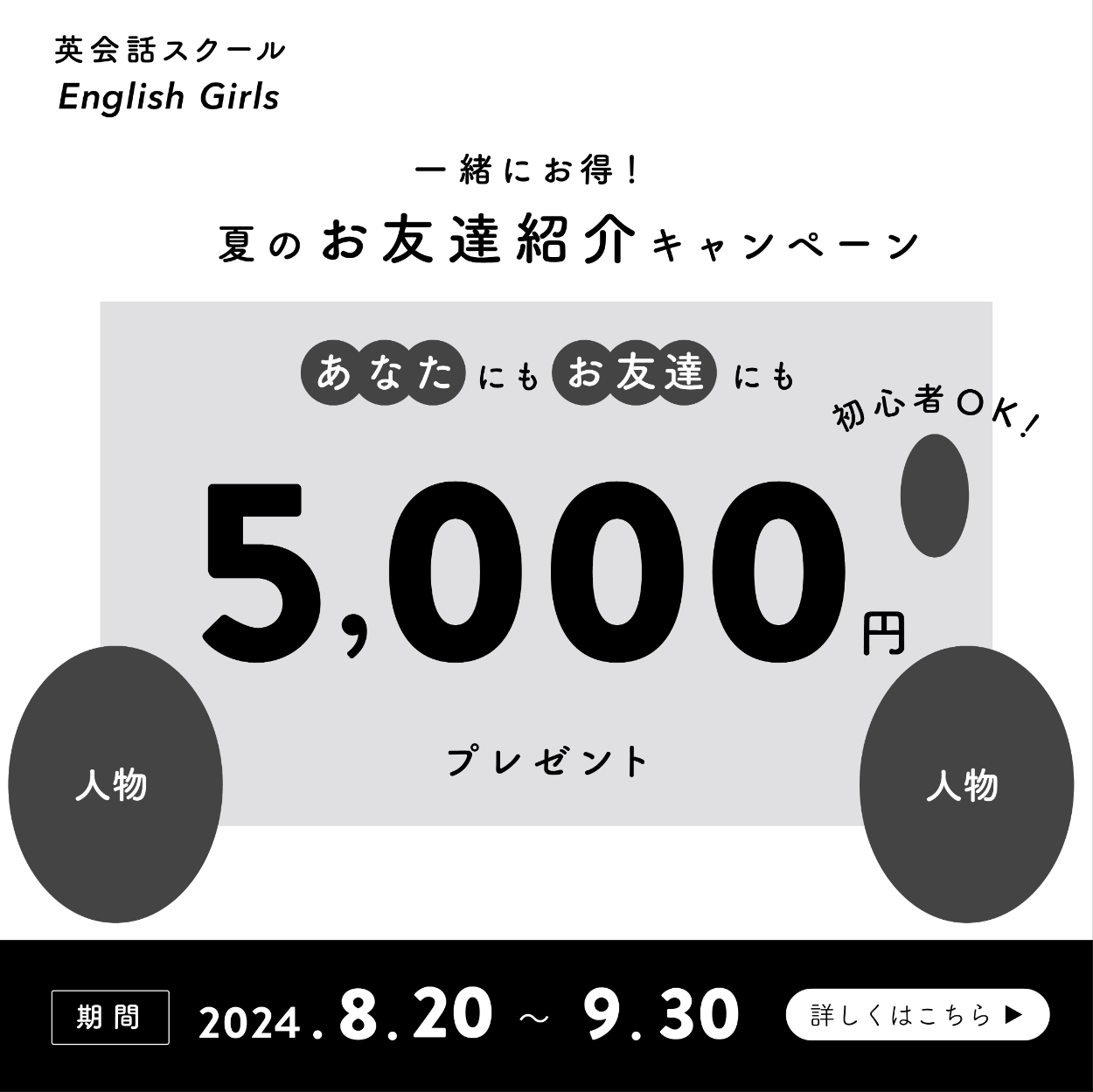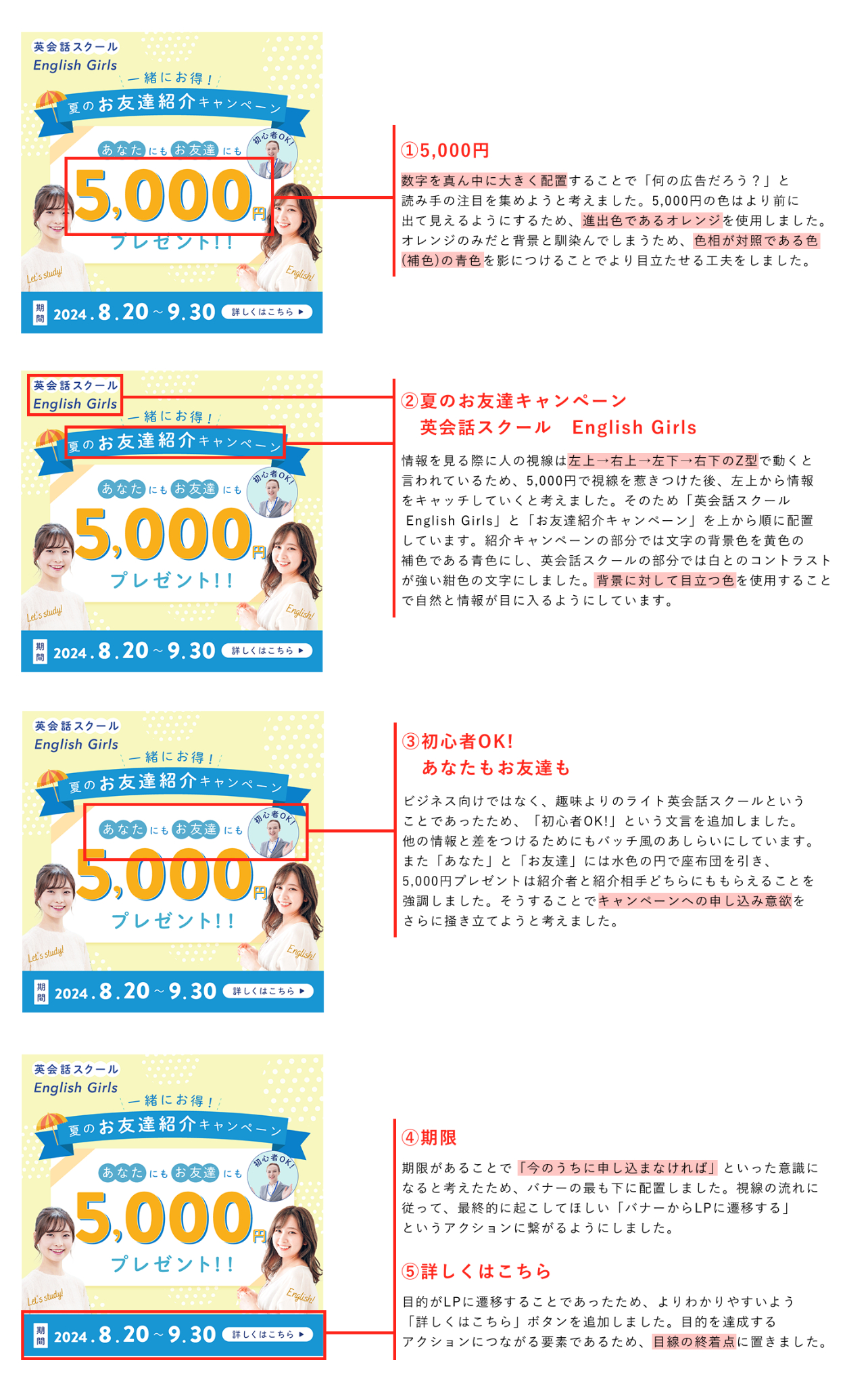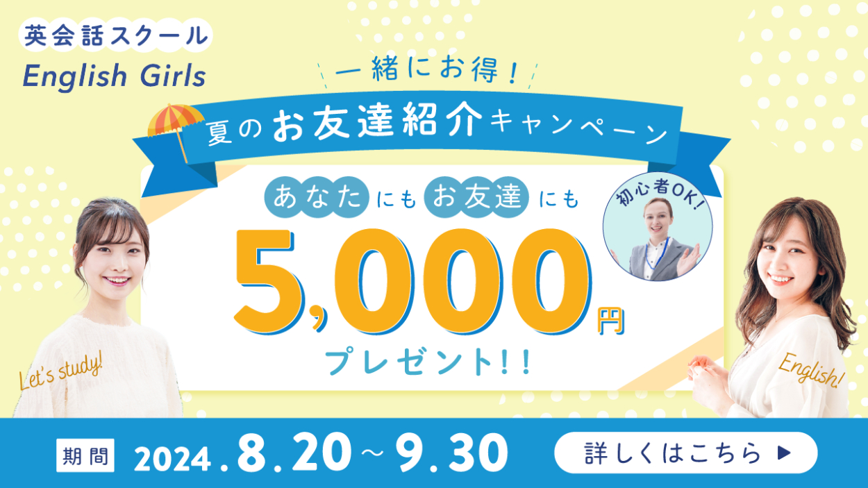 英会話スクールのキャンペーンバナーであることを直感的に伝えるために、英会話教室の先生の写真を追加しました。また女性2人の写真の上に英語のセリフを追加しました。