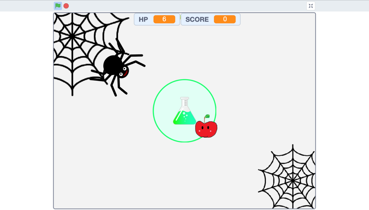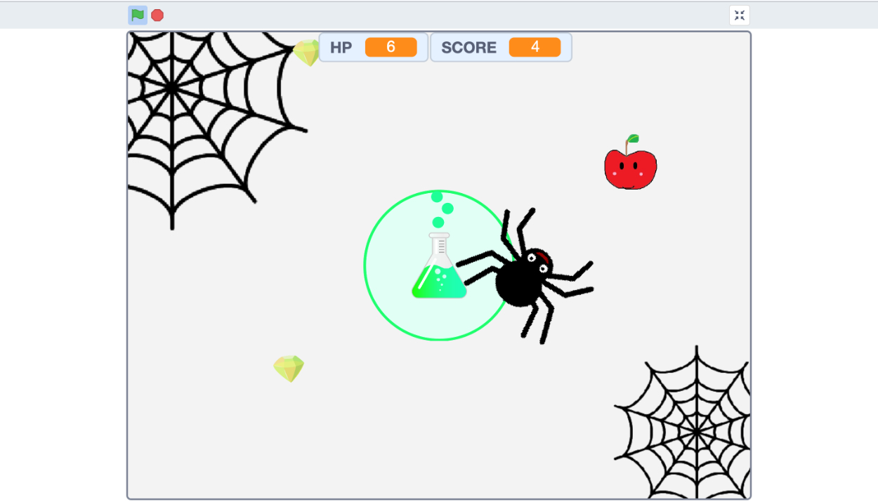 Scratchに移植するにあたって、当初はプレイヤーの動きがパターン化してしまい、ゲーム性が感じられませんでした。そこで、体力と得点の要素を追加し、それを自然と意識させることでフィールド全体を広々と移動させることが可能になりました。