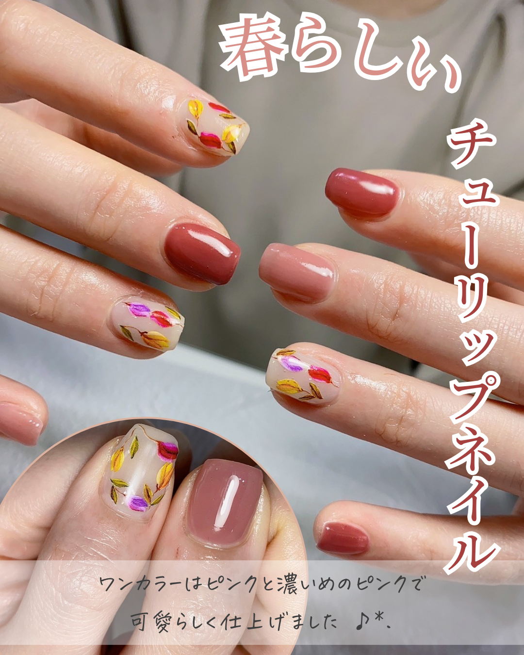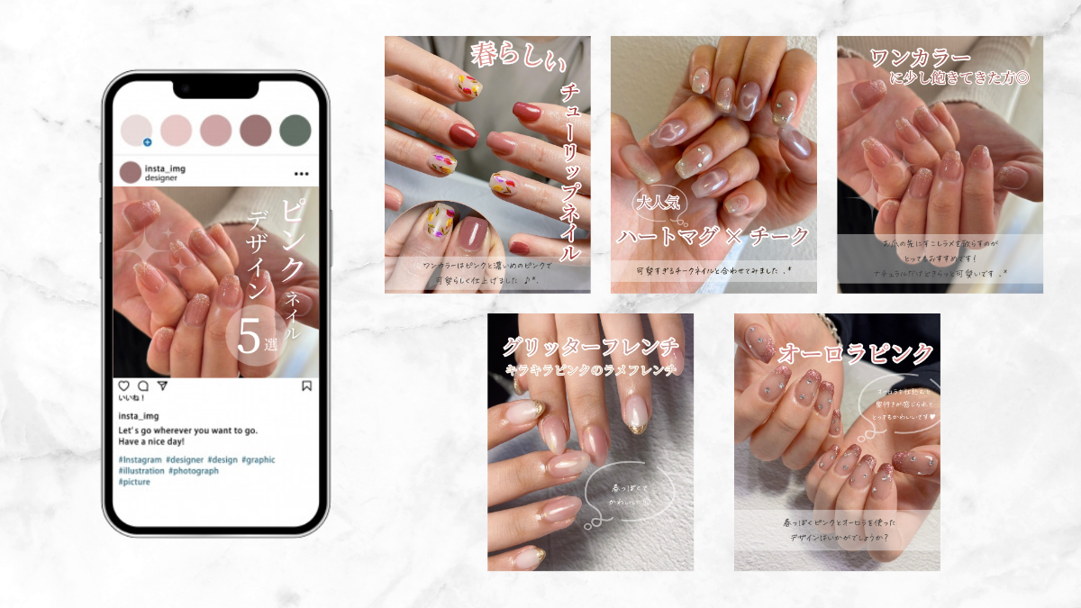 - "ピンク"と"5"の文字を大きく表示させることで、"ピンクネイル5選"の投稿だとひと目でわかるよう工夫しました。