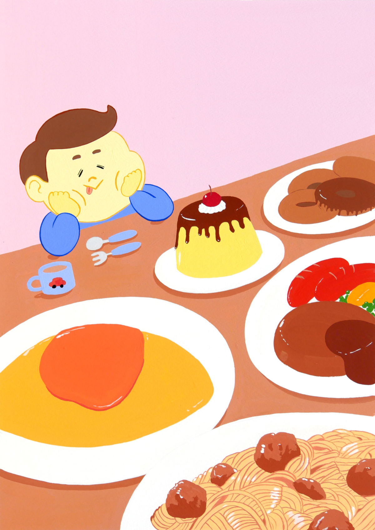 ごはん日和という架空の雑誌の表紙イラストを描くという課題。おうちで食べるごちそうをテーマに描きました。雑誌のタイトルを入れるため、上部1/3ほどスペースをあけています。