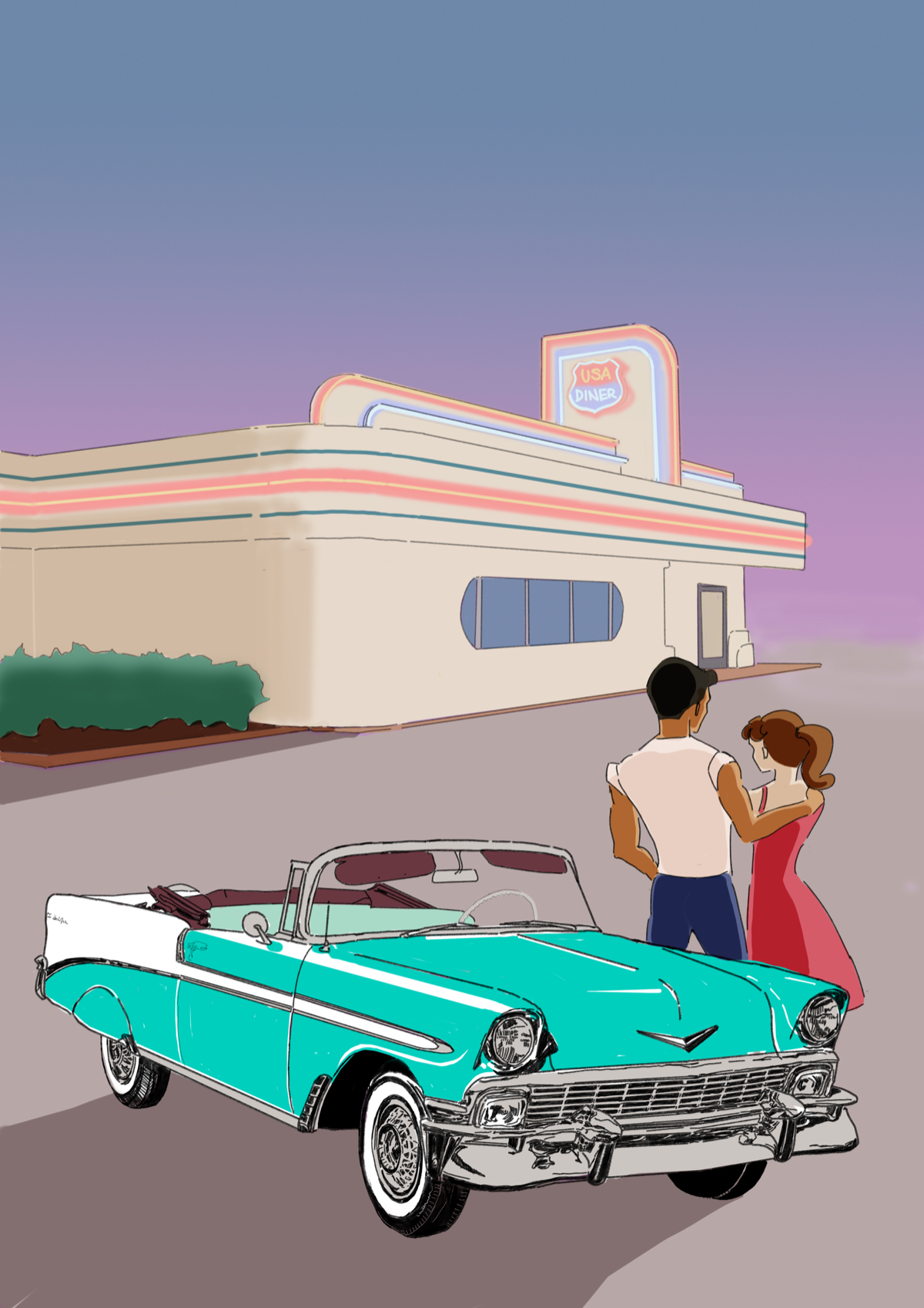 自動車日和という架空の雑誌の表紙イラストで、80年代のアメリカをヒントに描きました。上部に雑誌のタイトルを入れるスペースをあけています。